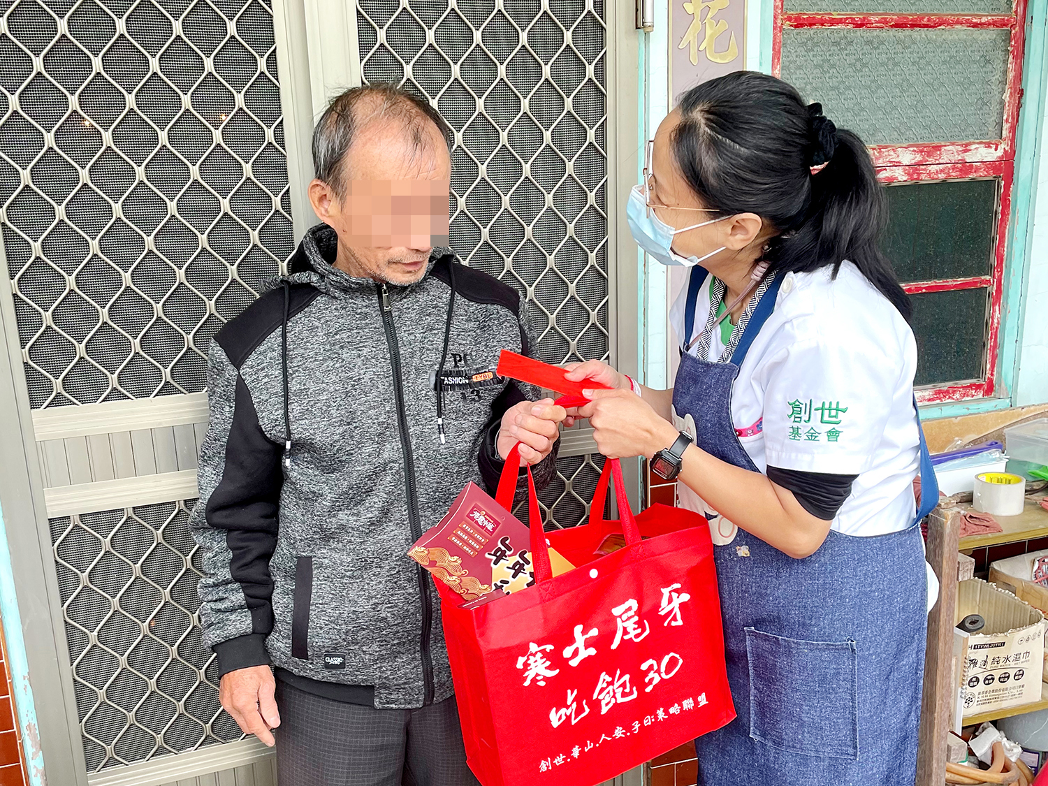 即將迎接長達9天的農曆春節,人人準備溫馨團聚,但對老弱孤苦的清寒植物人家庭、寒士、街友、單親媽媽及獨居長輩,春節卻更顯漫長艱苦;創世、華山、人安策略聯盟關懷殘、老、窮,辦理第36屆「寒士吃飽30」送禮到家活動,於2月2日集結善心馬力全開、送愛全台,創世基金會台南院護理師帶著義工、工作人員們齊心將年禮及紅包親送給植物人家屬,並貼上吉祥喜氣的春聯,傳遞社會真摯的關懷與祝福。
