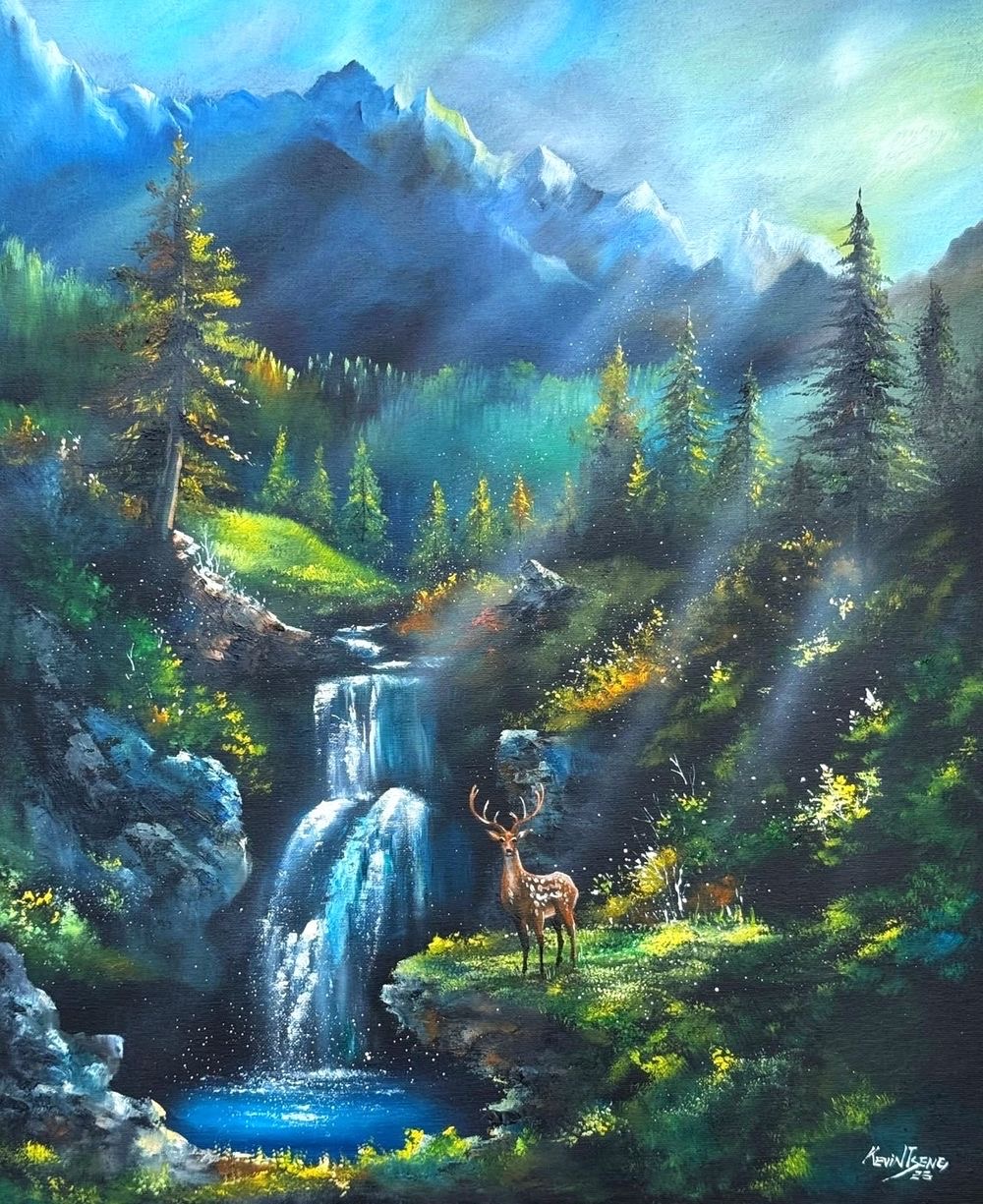 曾啟文的風水藝術創作,深深根植於台灣靈山秀水的埔里。他以巍峨山勢、流動水脈與瞬息萬變的光影,呼應風水哲學中「重山復水」的意象,象徵穩固根基與生生不息的循環。作品如《藏風聚氣 福澤長存》、《金色山脈 飛瀑聚財》,捕捉日夜更迭間的光線流轉,寓意能量的祝福與祥瑞的降臨,使觀者在畫前感受自然與心靈的和諧共振。