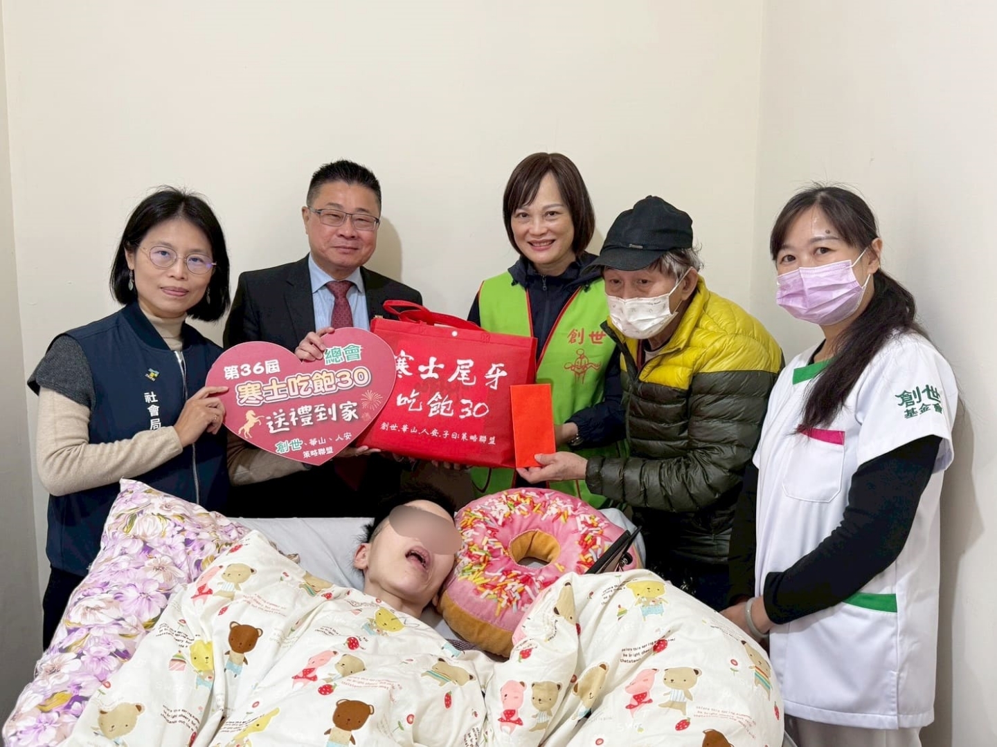 擔任愛心嘉賓的前副總統陳建仁表示:「以前在總統府前辦理寒士尾牙,這次更是把禮送到家,真的很貼心,大家齊心協力,把愛心送到每一個需要照顧的弱勢。」80年次的邱小姐,高三時小腦萎縮,上大學後開始退化,102年開始臥床,呈植物人狀態。由父親在家照顧,但父親本身也是身障者,家境貧困,靠低收、殘障補助生活。創世102年開始到宅服務,護理師每月提供原床泡澡、照顧物資協助等,減輕家屬的負擔。今天貴賓們親自將年禮及紅包送到家,並貼上春聯祝福他們能平安過好年。創世基金會廖經倫副董事長表示:「唯有全台眾善士長期的支持與肯定,這個溫馨社會善行的活動才能持續36年,我們將持續秉持著『行公義、好憐憫、存謙卑的心、敬天愛人地務實行善』的態度,確實做到每一份善款與物資都用在刀口上。」