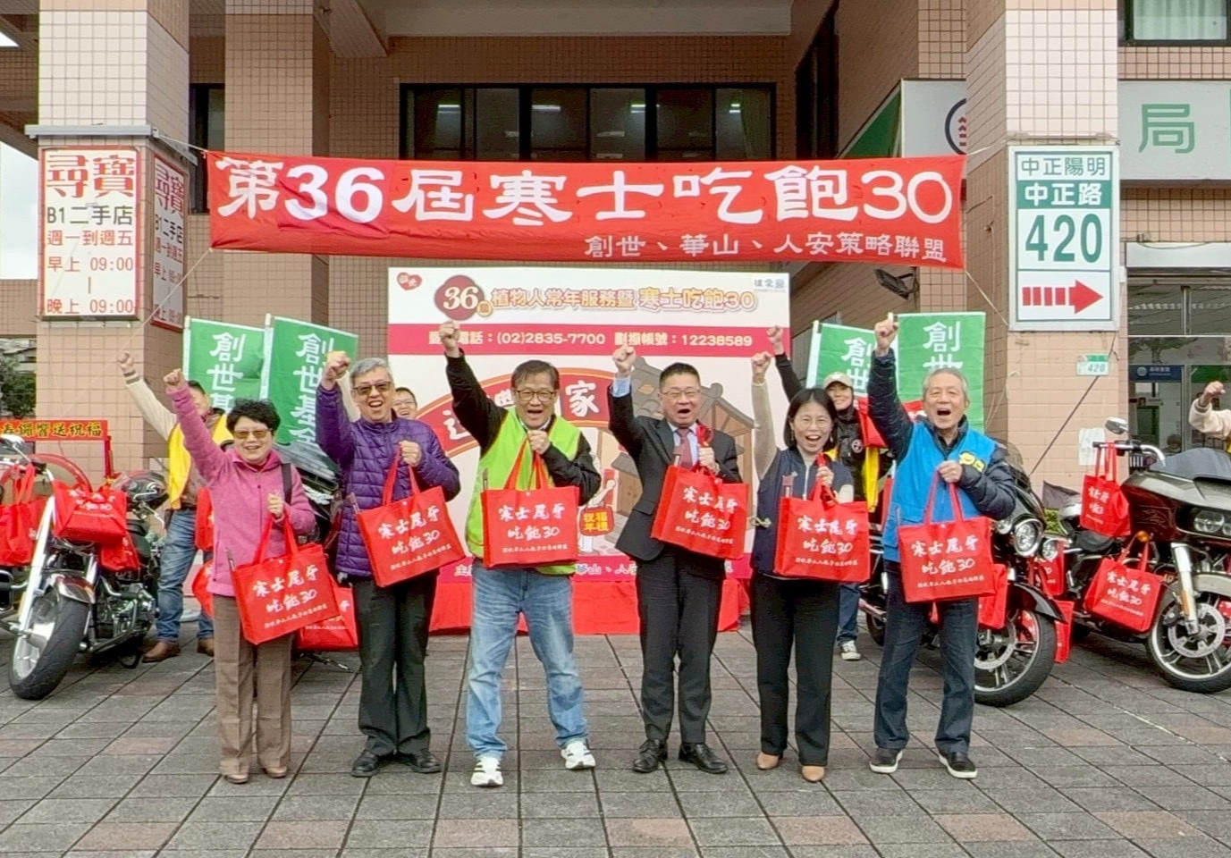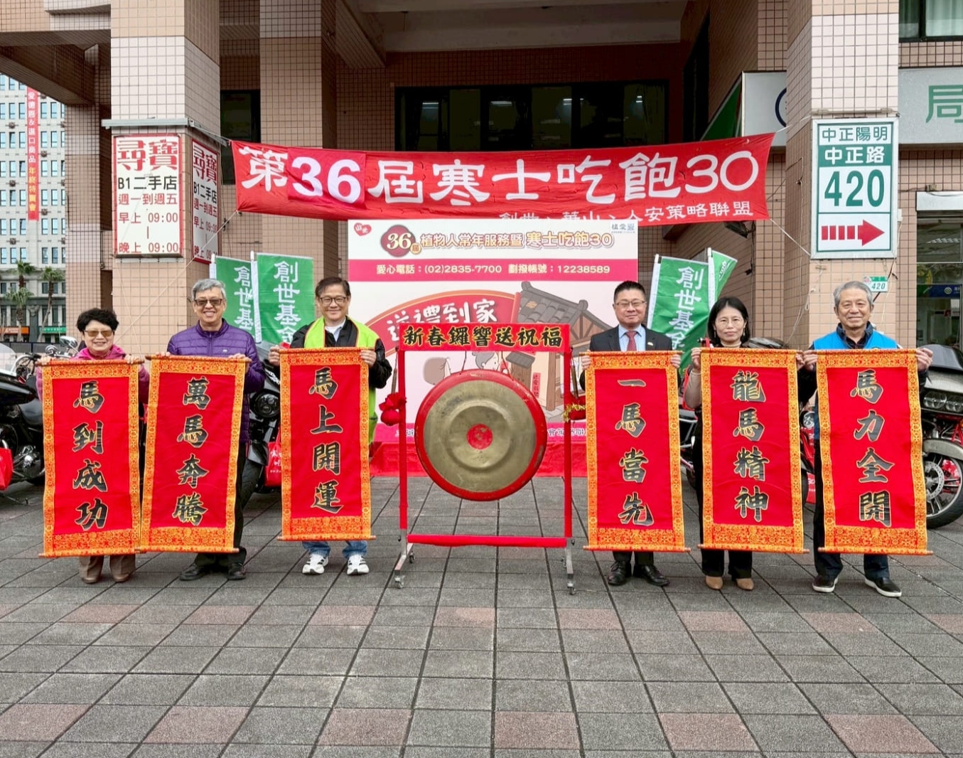 今2月2日創世、華山、人安策略聯盟關懷弱勢族群,為迎接農曆春節,人人準備溫馨團聚,但對老弱孤苦的清寒植物人家庭、寒士、街友、單親媽媽及獨居長輩,春節卻更顯漫長艱苦;創世、華山、人安策略聯盟,第36屆「寒士吃飽30」送禮到家活動,集結善心馬力全開,送愛台灣、澎湖、金門、馬祖。宋坤傳藝祥獅鑼鼓迎新春,開場磅礡振奮人心;前副總統陳建仁賢伉儷、衛生福利部呂建德次長、台北市社會局林淑娥副局長、富邦慈善基金會鄭基男董事,敲響愛心鑼並獻上馬年吉祥祝福,台灣知名哈雷雷公機車隊也共同擔任送禮大使,15台重機更以轟隆引擎為開跑儀式吹響號角,象徵萬馬奔騰,齊心將年禮及紅包親送至植物人家庭,傳遞社會真摯的關懷與祝福。