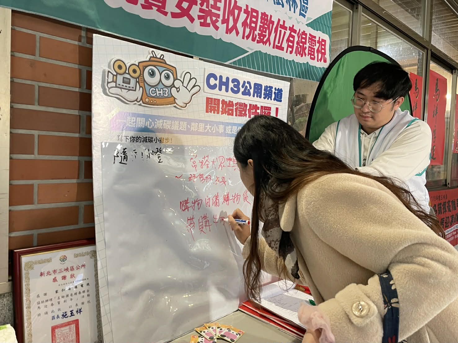 ▲三峽邀請民眾填寫減碳議題留言板 。(圖/中嘉寬頻提供)