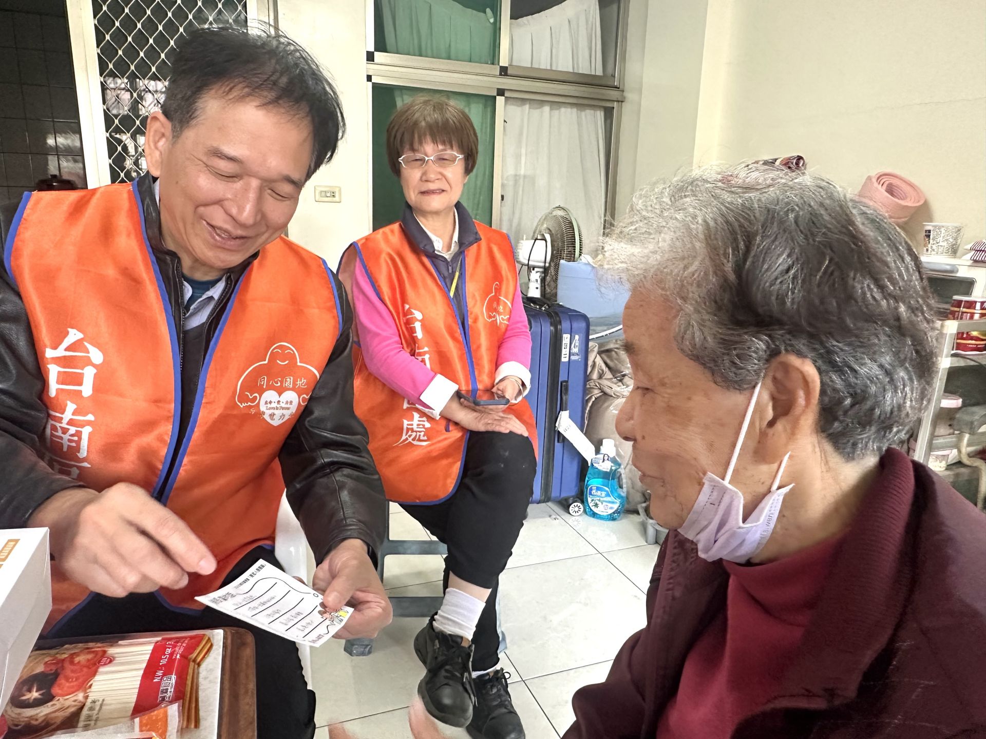台南區處處長廖學智今天一早和吳站長一同拜訪和關心獨居長輩的健康狀況,除送上年節禮品與紅包,並叮囑長輩定時用藥、注意保暖,祝福爺爺奶奶們常保身體健康、心情愉快,一起歡喜迎接馬年的到來。吳站長對台電長期支持關懷獨老的慈善活動表達感謝,廖處長和同仁的拜訪讓長輩在年節前夕感到特別暖心。