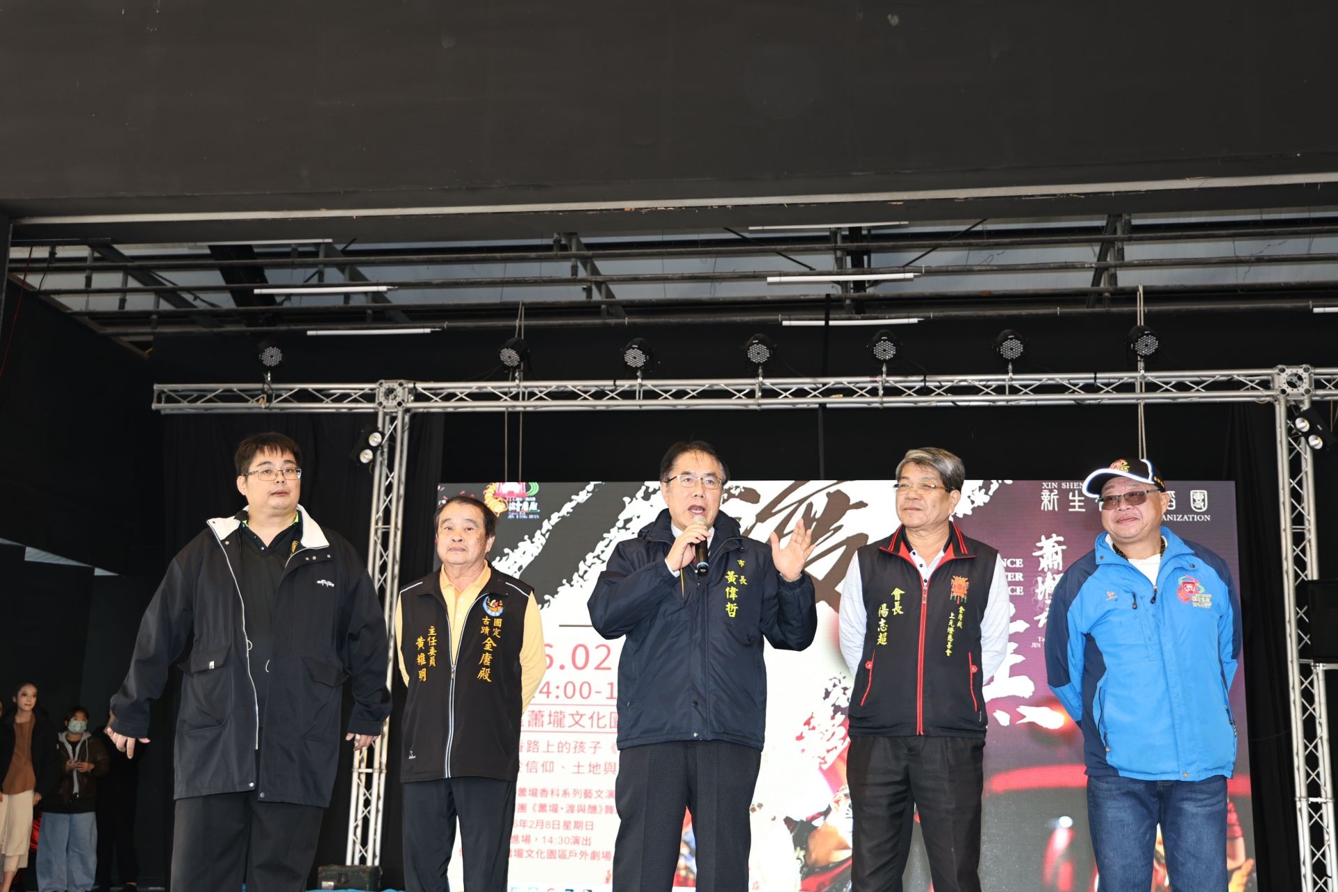 ▲市長黃偉哲親切慰勉麻豆新生代舞蹈劇團演出團隊與參與演出的孩童,肯定以舞蹈劇形式傳承蕭壠香科文化,並為孩子們加油打氣。(新聞處 提供)