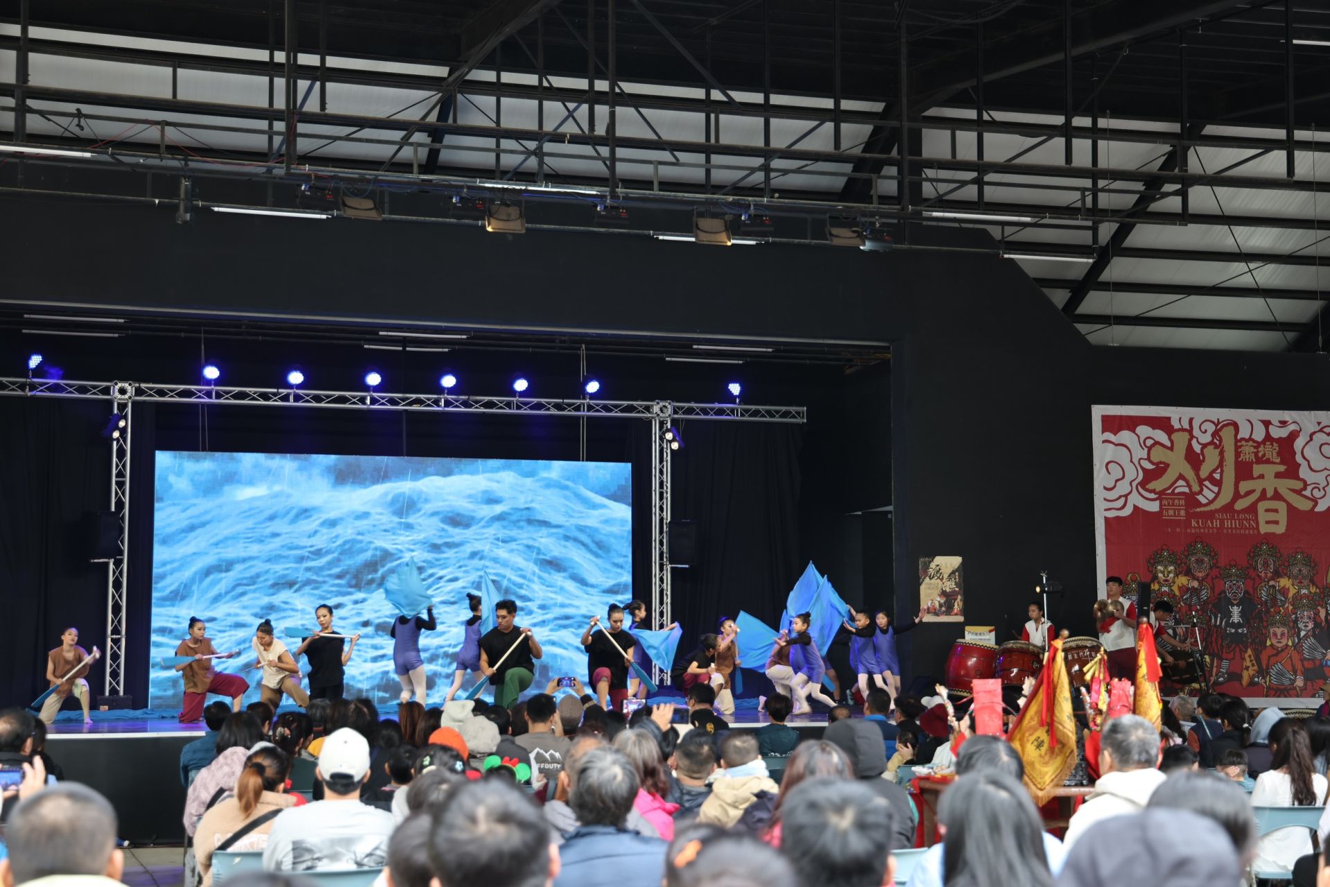 ▲舞台上演舞蹈劇《蕭壠・渡與醮》,舞者以肢體語彙結合影像投影,重現香科遶境與渡儀式的文化意象,吸引大批民眾駐足欣賞。(新聞處 提供)