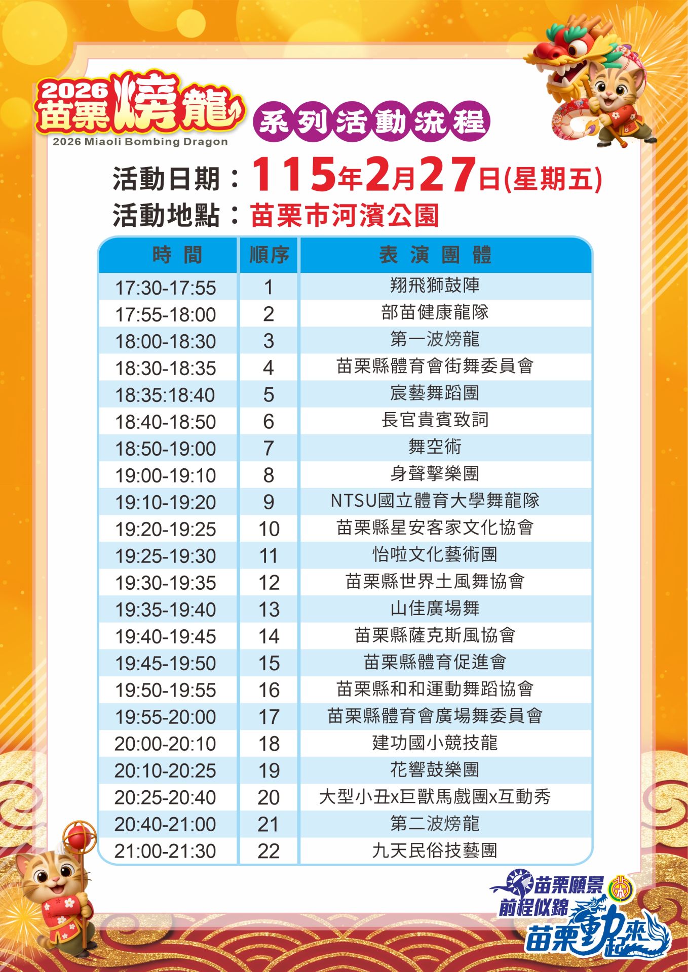 主場地河濱公園舞台更是精彩可期,邀請到氣勢磅礡的南庄翔飛獅鼓陣、享譽國內外的九天民俗技藝團、節奏震撼的花響鼓樂團、展現高難度技藝的國立體育大學舞龍隊,以及融合音樂與肢體律動的身聲擊樂團輪番上陣;此外,深受小朋友喜愛的巨獸馬戲團也將帶來歡樂驚喜演出,在地建功國小龍隊更以青春活力展現傳承精神。