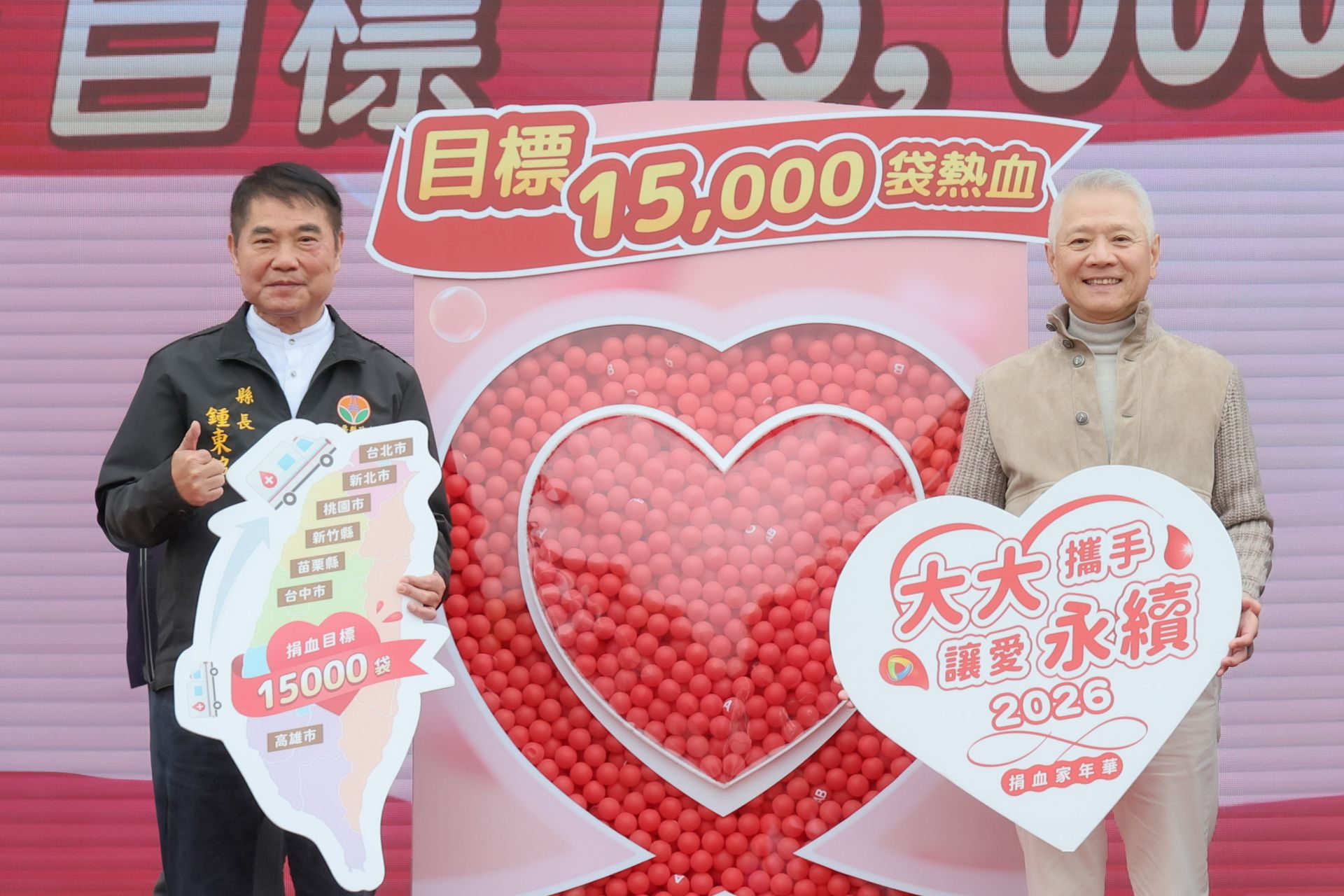 由大大數位基金會發起的「大大攜手 讓愛永續」捐血家年華活動,9日愛心列車駛進苗栗縣政府前廣場。繼高雄、台中站後再度掀起捐血熱潮,大大數位基金會董事長戴永輝、榮譽董事長李大維與苗栗縣長鍾東錦共同號召鄉親挽袖捐血,為全台血庫注入暖流。