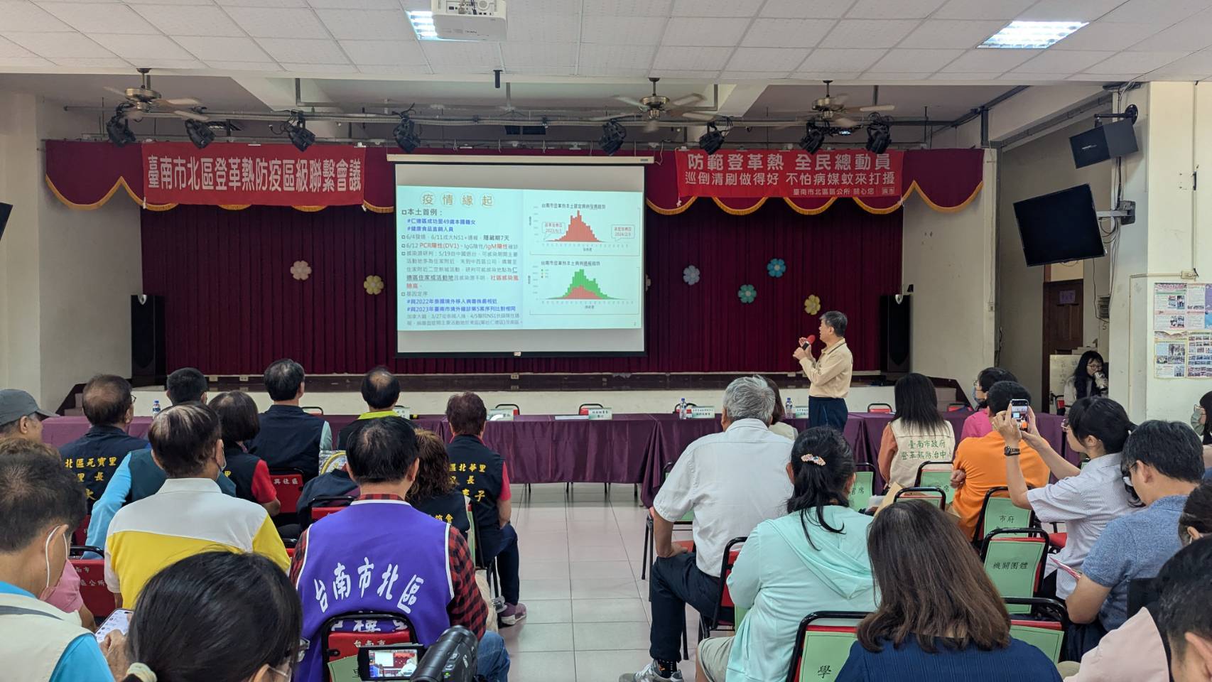 為強化登革熱防治量能、凝聚防疫共識,北區區公所於今(31)日上午10時在振興里活動中心召開登革熱防疫區級聯繫會議及誓師大會。會議邀集衛生福利部疾病管制署、衛生局、環保局、各里防疫志工隊隊長(里長)及北區轄內與登革熱防疫相關之單位,包含社區、市府局處、仁愛之家、學校、國營事業單位、國軍等機關,計有近200人共同參與,展現公私協力、全民防疫的決心。