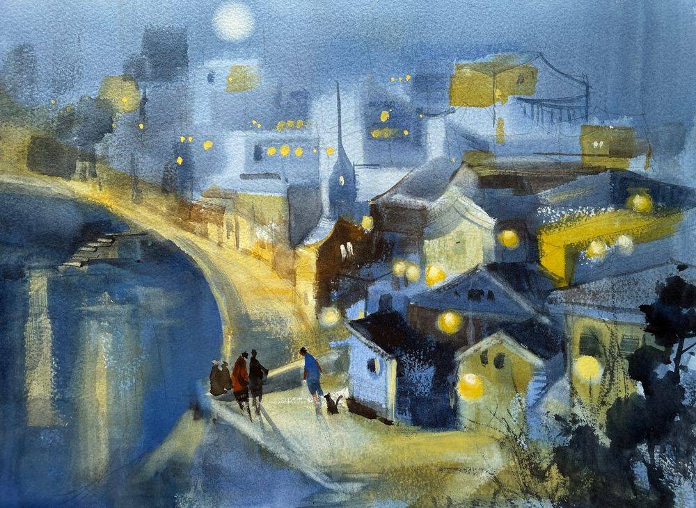 連雅綺的創作則偏向內斂與詩性,她以低飽和色彩與柔霧筆觸,構築出介於記憶與現實之間的曖昧場景。她關注時間如何在日常中留下痕跡,並透過模糊邊界與留白,使畫面具有開放性的情緒投射空間。《芹壁月照》以低飽和的灰藍色調,呈現月光灑落海岸的靜謐瞬間,畫面邊界模糊而詩意,彷彿將觀者帶入一段被拉長的夜晚記憶;《雨季的校園》則以細雨與空間的交織,描繪熟悉場景中的情感層次,在朦朧與留白之中,喚起關於時間、青春與記憶的微妙共鳴。其作品不強調敘事,而是在靜默中留下深遠餘韻。