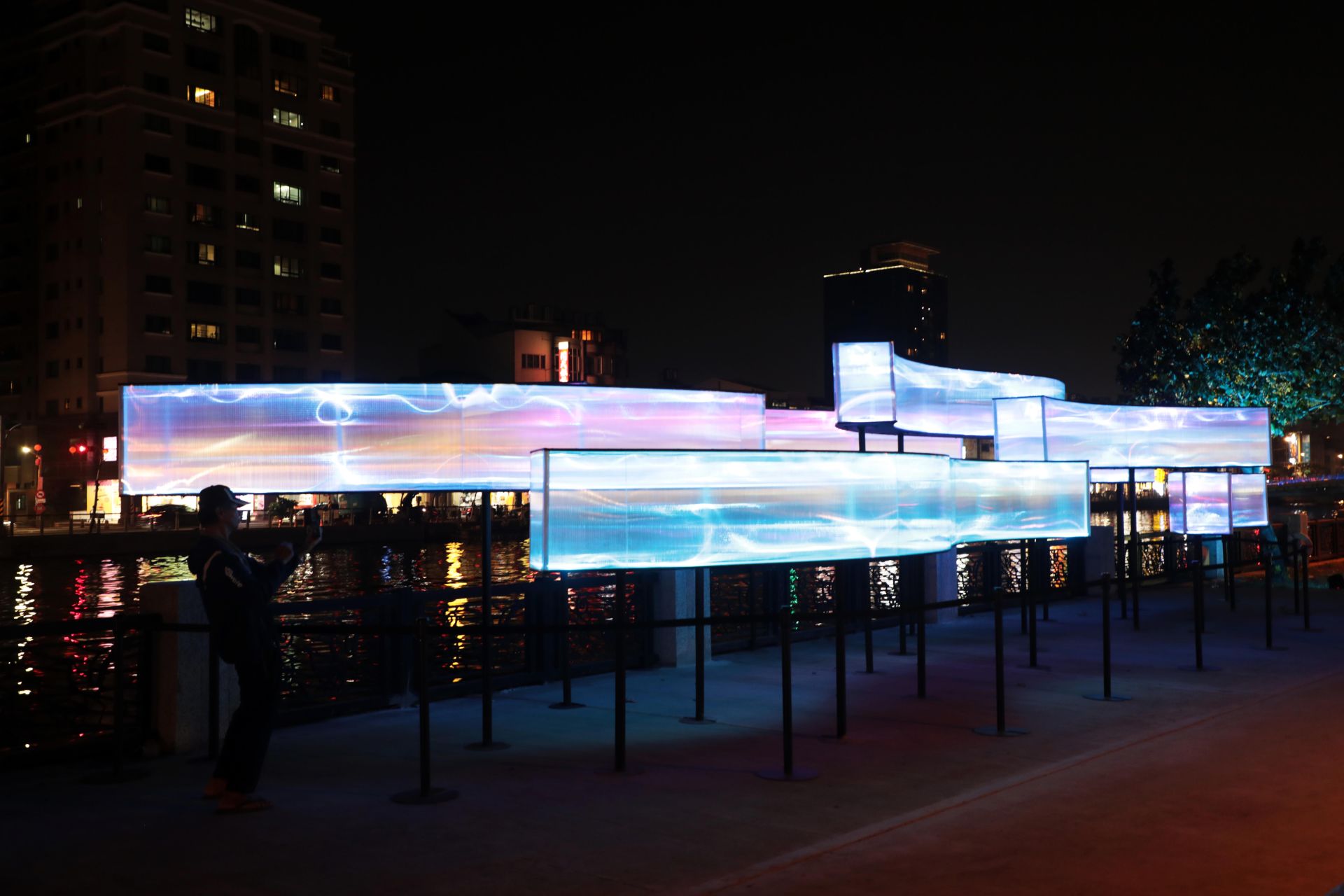 三件燈光藝術作品各具意象:「光流百年」以光軌象徵水流與時代更迭,呈現城市記憶的延續;「運河織光」以光線編織循環意象,展現時間流轉與生命能量;「光蘊平安」以竹編舟體結合水下光影,喚起過往運河生活記憶,寓意平安順遂。