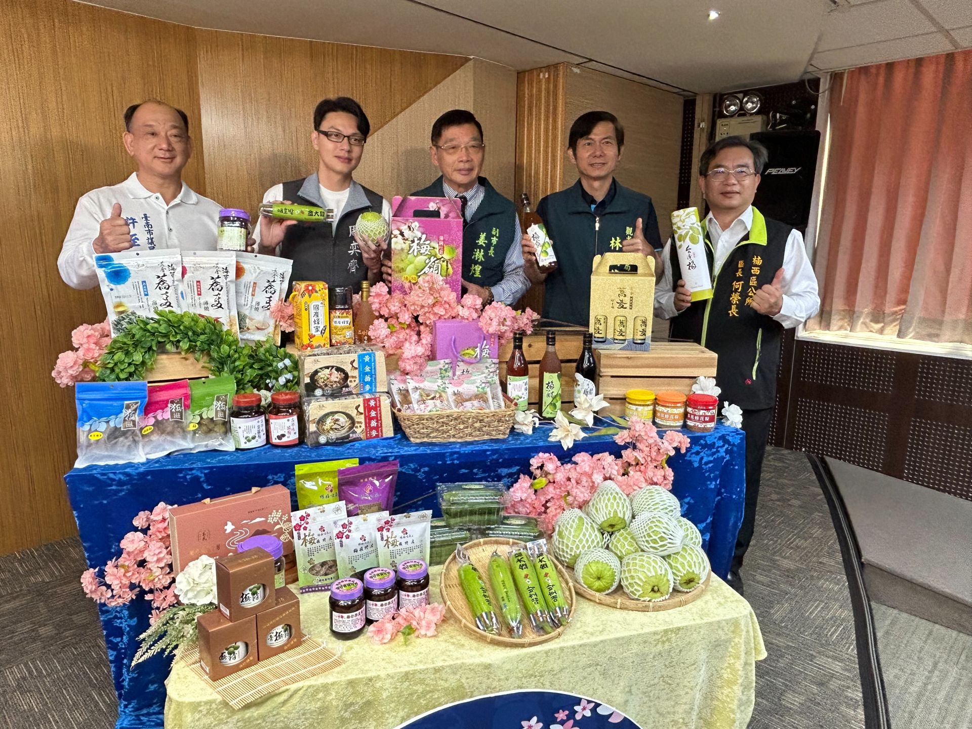 ▲副市長姜淋煌及觀旅局長林國華等人幫楠西區農民行銷產品。(記者黃雋淮 攝)