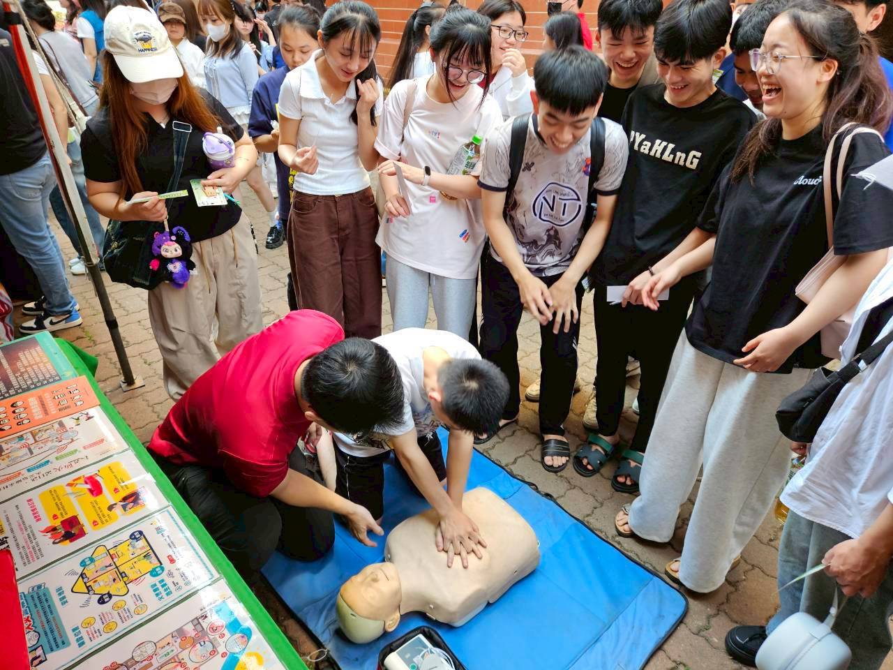 ▲中華醫事科技大學及消防局指導外籍學生學習救人的CPR。(勞工局 提供)