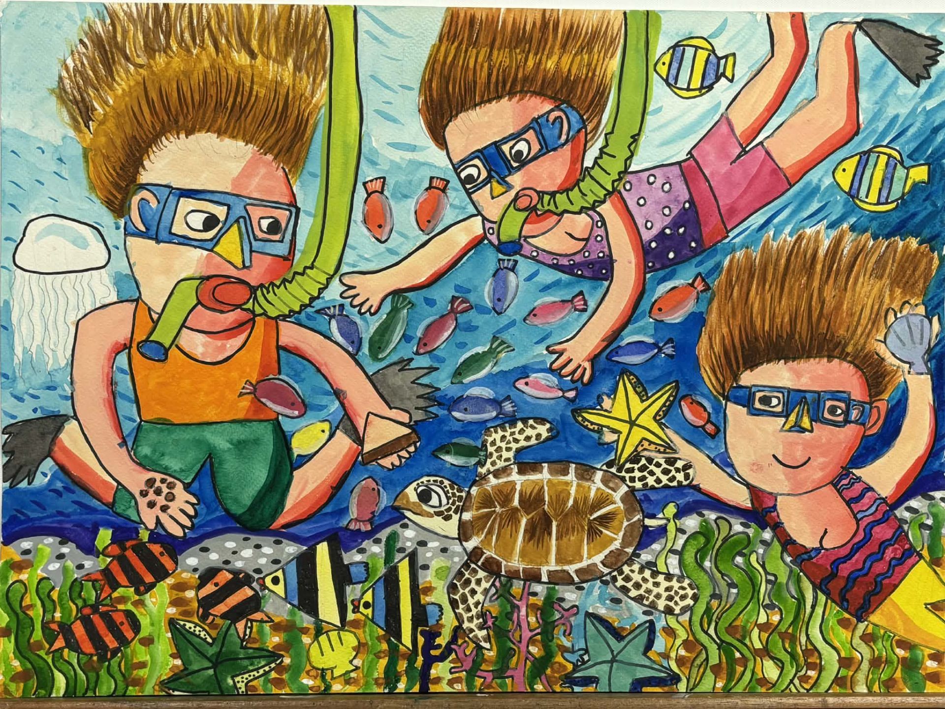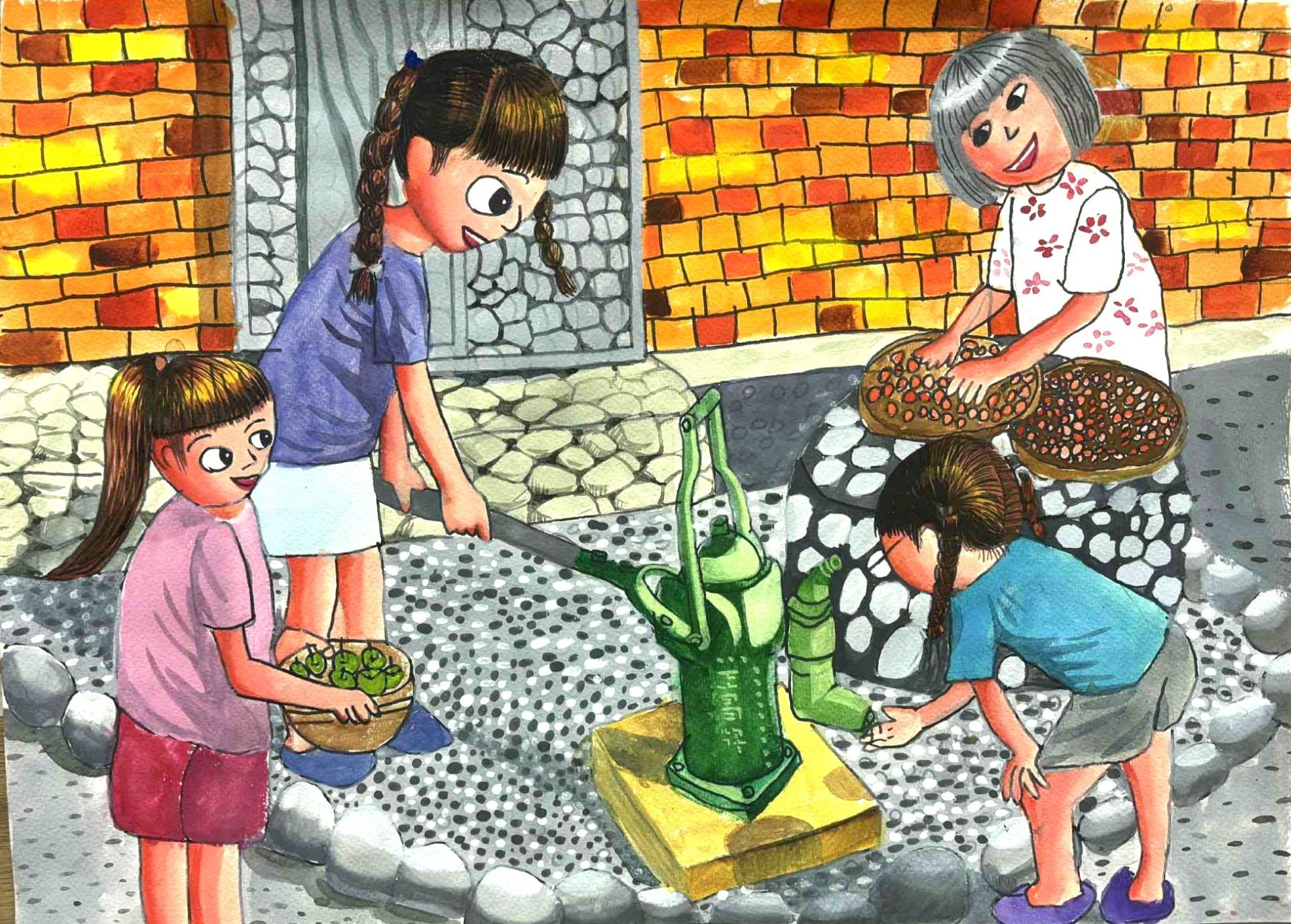 苗栗社大「花漾植物彩繪班」作品展現學員從零開始學習調色與構圖的成果,透過壓克力顏料描繪花草之美,在創作中達到療癒與沉澱的效果,展現藝術學習的成長軌跡。《外婆家的紅棗假期》繪本原畫展,則以苗栗公館石墻村為背景,由學童實地走訪後創作,描繪採紅棗與鄉村生活的溫馨記憶,呈現地方文化之美,也為觀光推廣注入童趣與情感。此外,從事美術教學近三十年的廖老師,今年首次舉辦其兒童畫室成果展,展出多件學生得獎作品,為教學生涯留下重要紀錄。