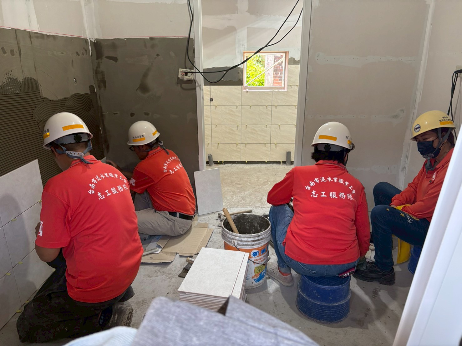 ▲泥水工會志工進行牆面填補、廚房浴廁壁磚等修繕工程。(勞工局 提供)