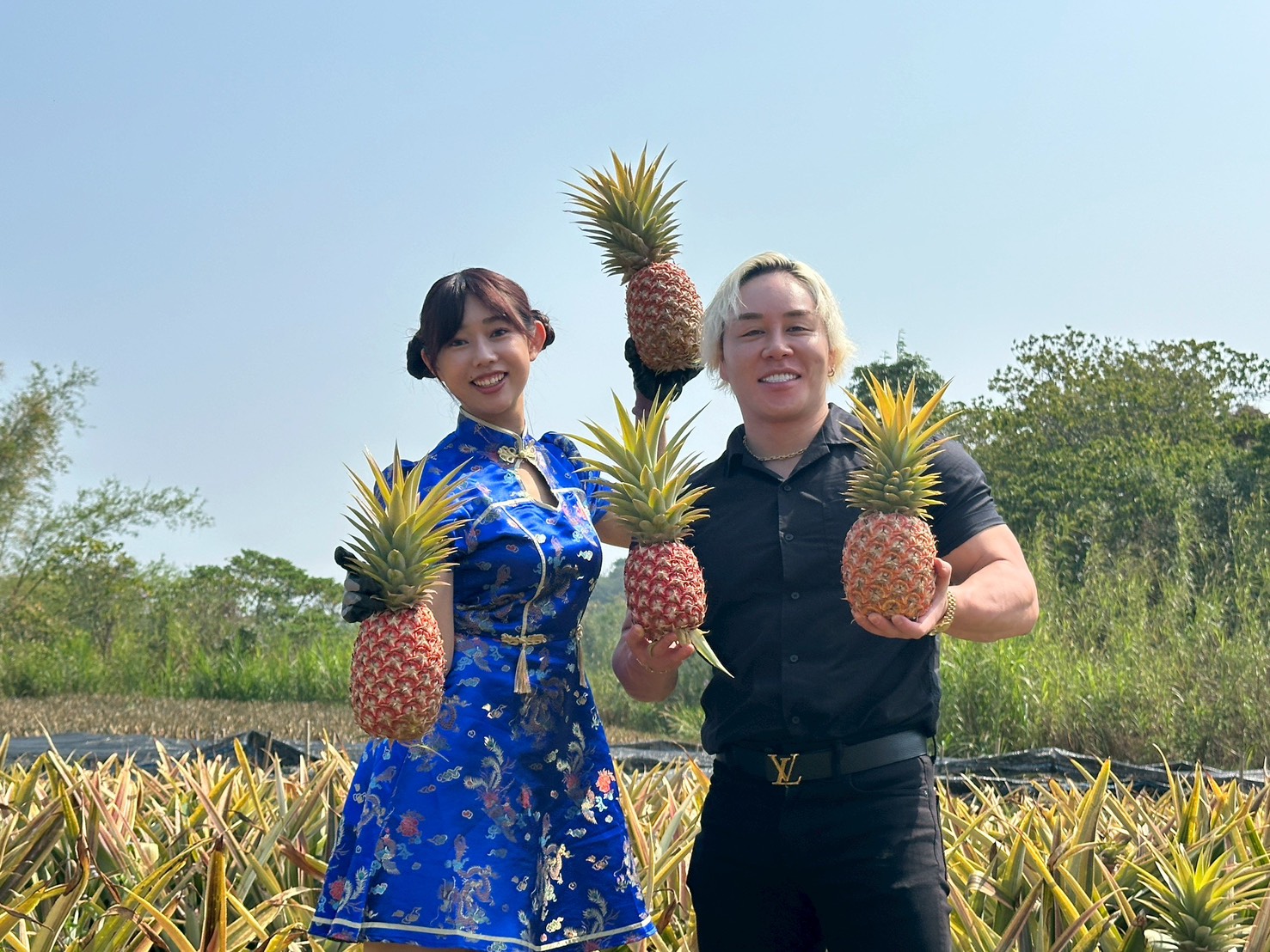 ▲崛江聖於關廟鳳梨田體驗摘鳳梨。(觀旅局 提供)