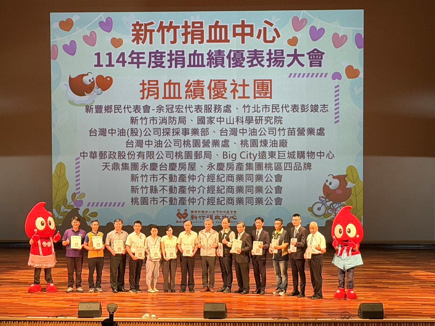 新竹捐血中心22日下午1時在中央大學大禮堂舉辦「114年度捐血績優表揚大會」,公開表揚桃園、新竹、苗栗四縣市共3,992位長期投入捐血的熱心民眾,以及132個績優團體,感謝他們以實際行動挽救無數生命。