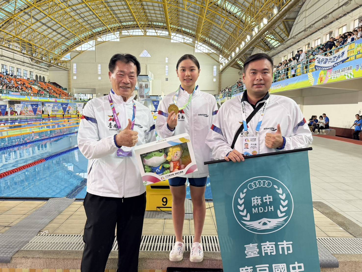 ▲麻豆國中 游泳何康婗選手(中)(體育局 提供)