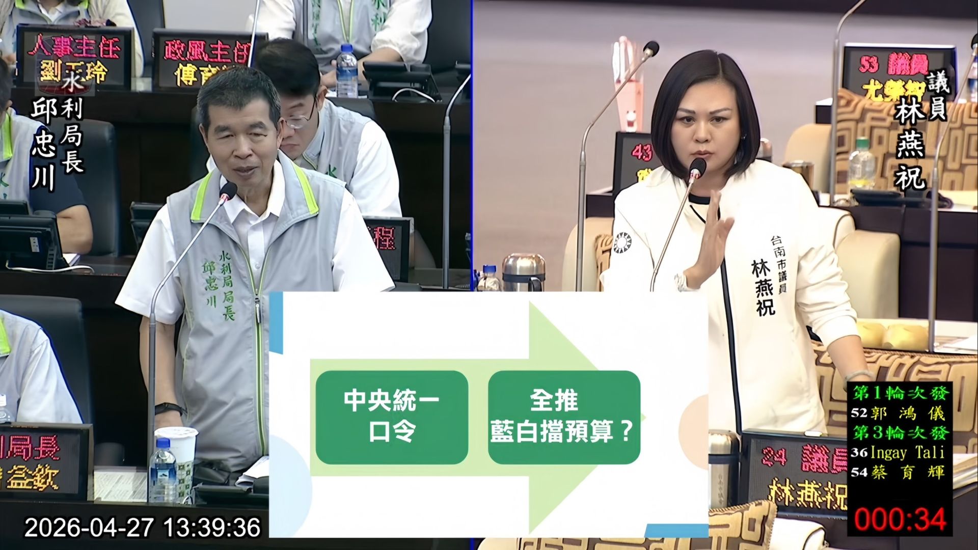 藍白立法院擋台南治水預算?台南市議會國民黨團書記長林燕祝質問水利局長邱忠川,立法院何時擋新興計畫預算?更有綠營議員說,藍白擋了台南市十三件二十億的治水預算,林燕祝強調,藍白三月,在立法院就三讀通過718億元新興計畫預算,無錢可用,全都因行政院長卓榮泰未批公文,卓院長直到四月二十一號才讓公文過關,請人民不要再被謠言所騙,藍白,從來都不會擋防災救災民生預算!