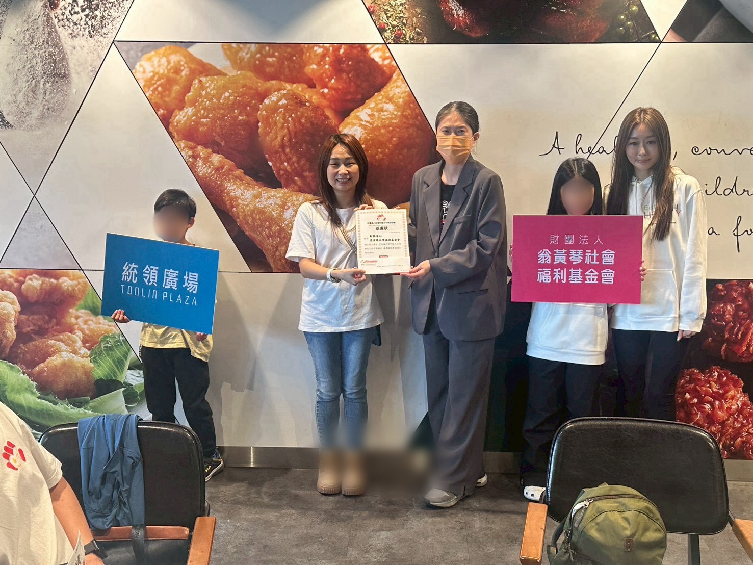 兒少希望協會秘書長林芯怡(左二)頒發感謝狀給統領廣場店長郭玫君協理(右三)。圖/統領廣場提供