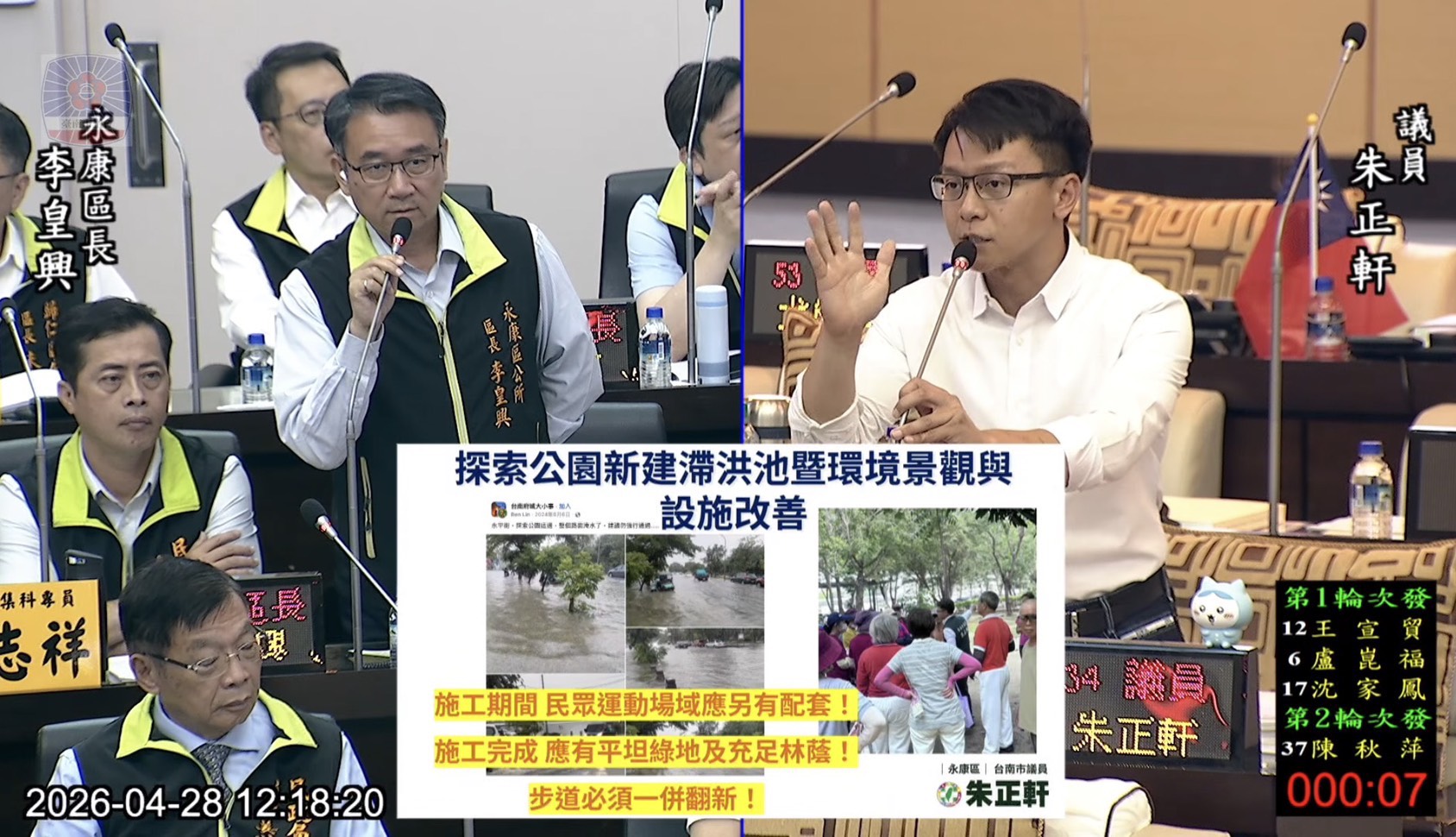 永康探索公園即將進行滯洪池新建工程,屆時將影響在地運動民眾,朱正軒希望市府各局處可以協助盤點適合的替代場地,回應民眾的運動需求。永康區區長李皇興表示,近期都有積極現勘尋找適合地點。