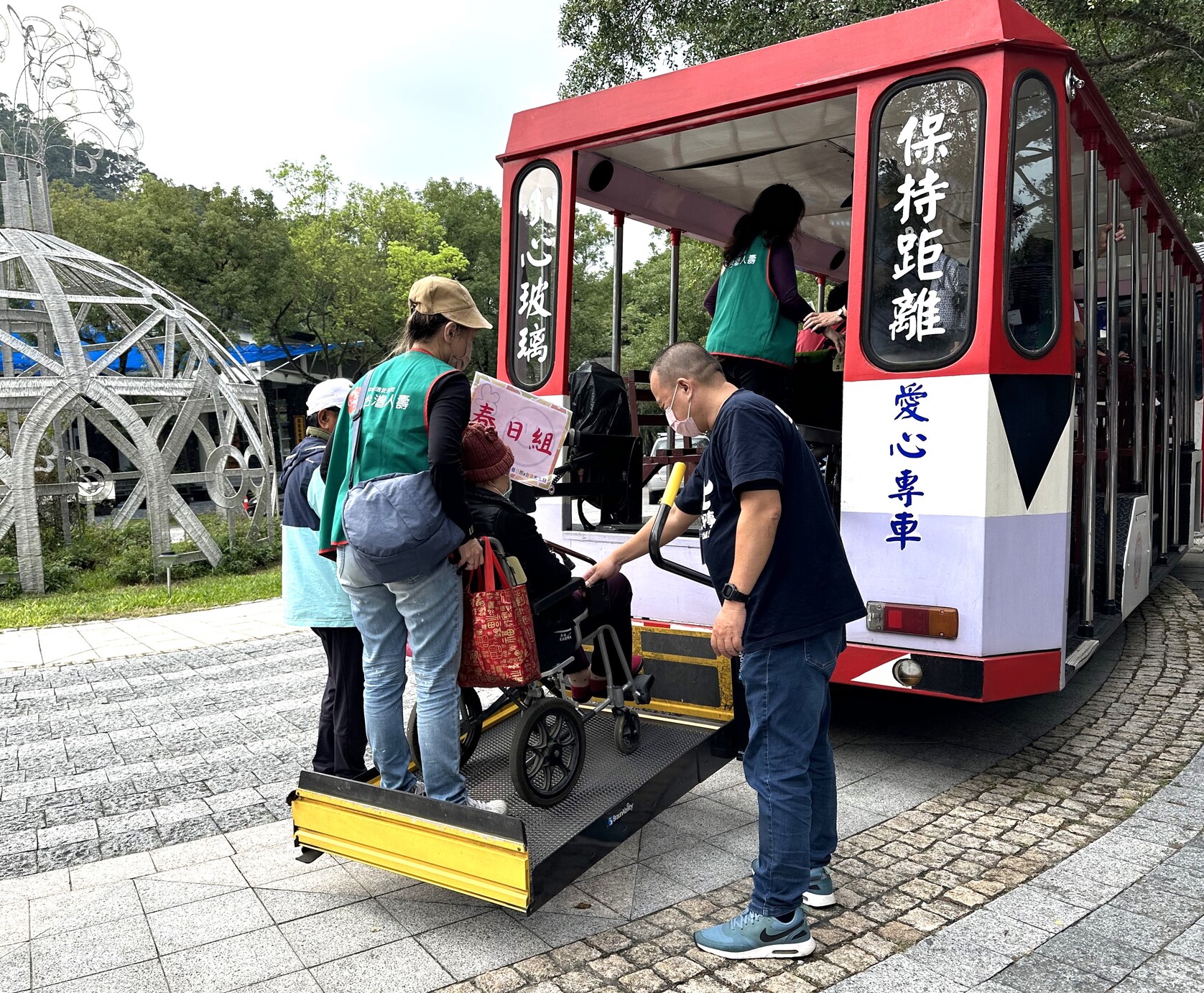 ▲在企業志工的協助下,長輩搭乘遊園車一覽山林間的壯麗美景。(圖/畢嘉士基金會)