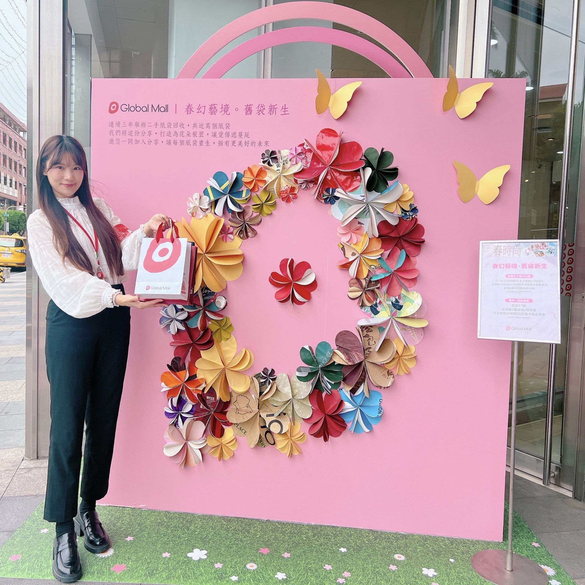 同時搭配春日時節、展現再生創意,讓回收紙袋變身春季環保藝術裝置,於1樓大門外打造「春幻藝境・舊袋重生」打卡點,在放大版的購物袋上,點綴著運用二手紙袋再製,融合櫻花粉、草木綠、明亮黃色調,以手工摺出的巨型立體紙花,營造百花齊放的春日意境,傳遞對環境友善的溫暖力量,3月26日前拍照打卡,還有機會抽中環球點數500點(全台抽20名)。