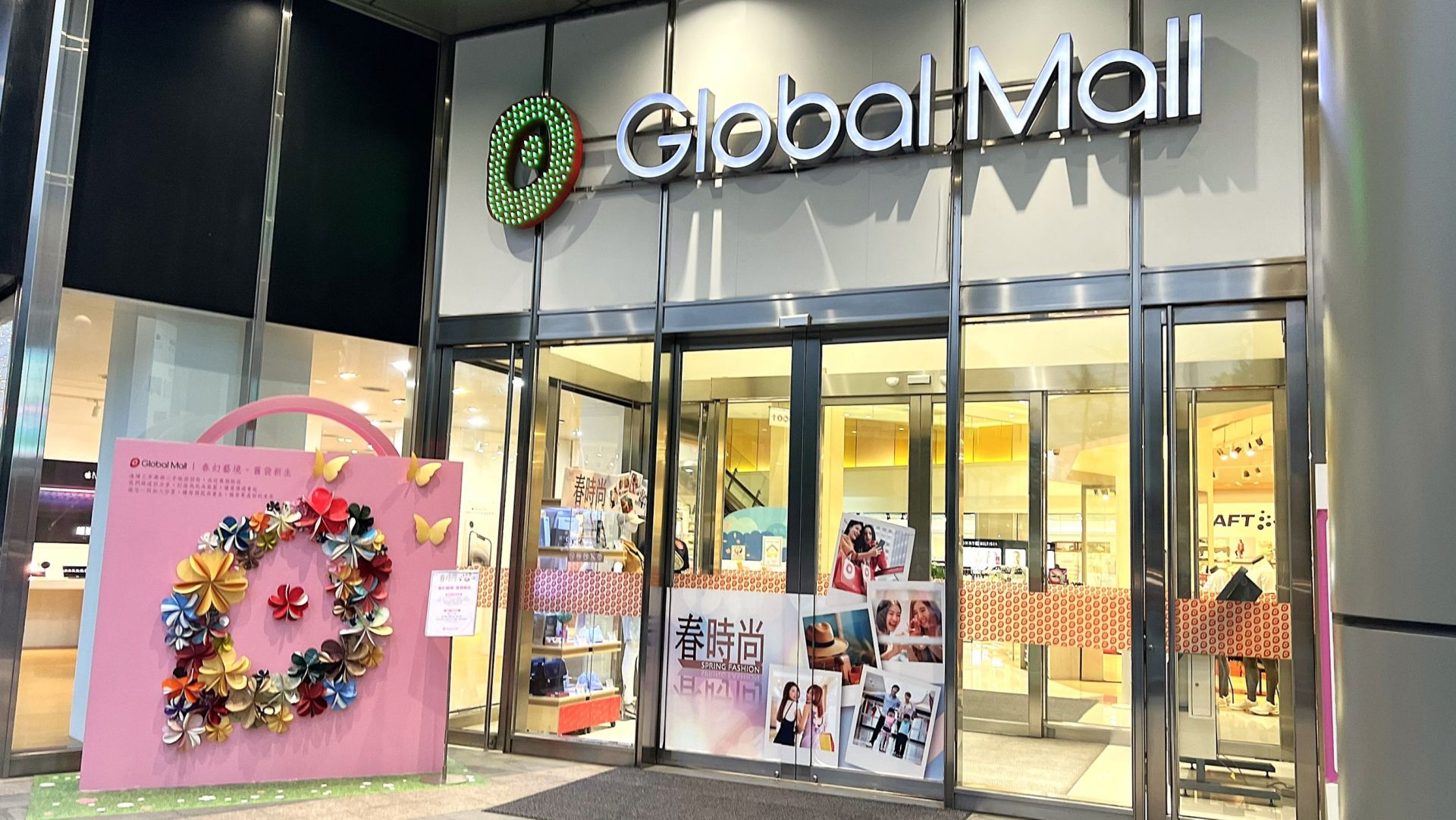 ▲Global Mall屏東市三月將LOGO燈變為綠色、二手紙袋打造春日紙花,推展綠色好生活。(圖/Global Mall屏東市)