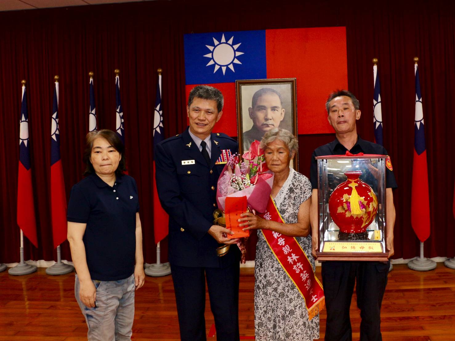 江陳金英女士,現年81歲,早年喪夫,育有5名子女,秉持我中華婦女傳統美德為家庭盡心盡力,含辛茹苦獨自撫育家中子女,長子在臺南市政府警局白河分局服務,孫女亦服務警界;江母撫育子女用心,身兼父職,克勤克儉將子女栽培有成,足為人母典範,本年更獲內政部警政署全國警察模範母親殊榮。