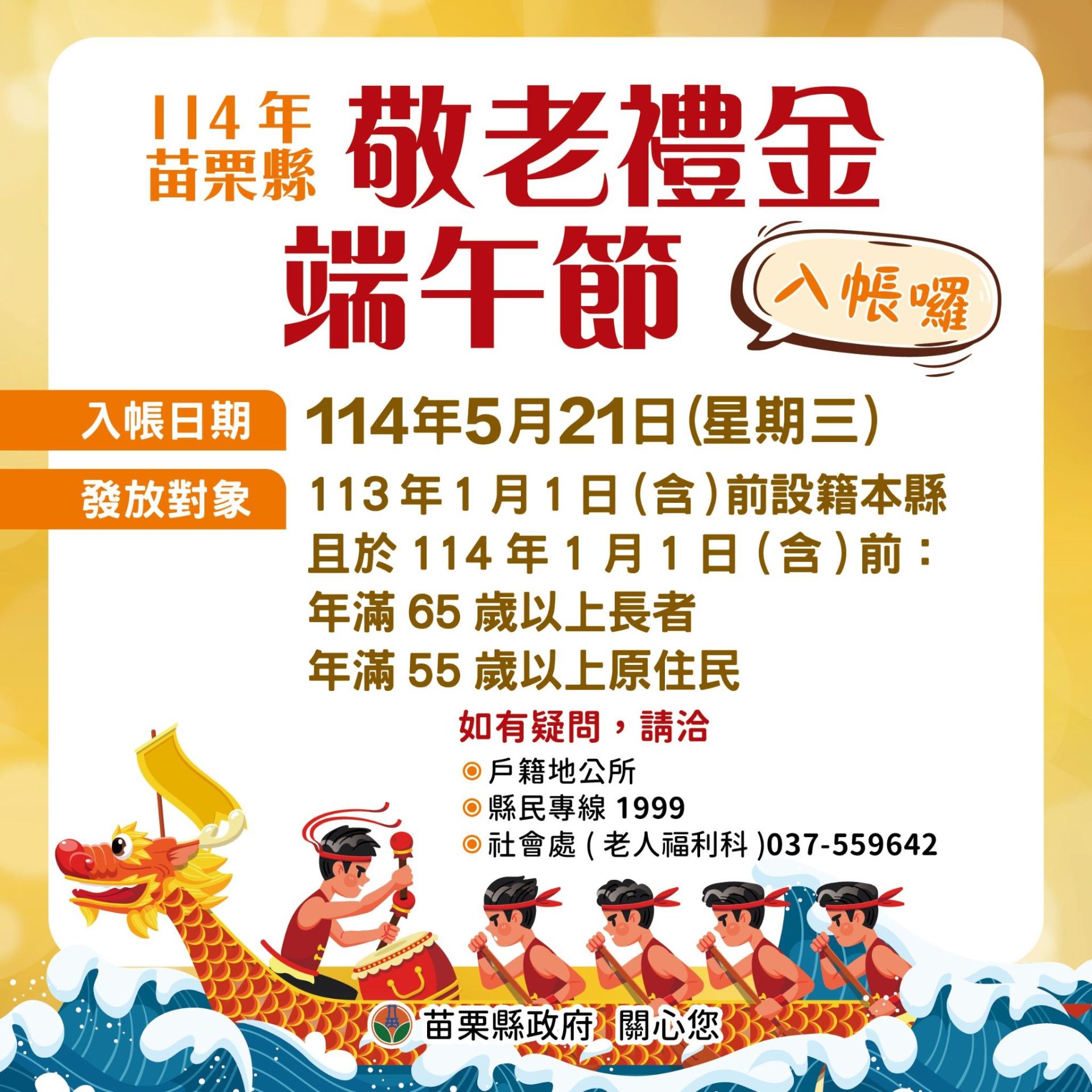 【記者小雪/苗栗報導】端午節將屆,為表達對高齡長者的關懷與祝福,苗栗縣政府訂於114年5月21日(星期三)發放端午節敬老禮金,此次共計10萬1,134位長者符合領取資格,每人可領到新臺幣1,000元禮金,傳遞縣府對長者的溫情與敬意。