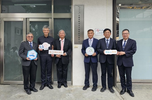 圖4:「國立中山大學—高雄長庚紀念醫院竹梅源解剖及手術模擬創新中心」揭牌啟用。左起中山大學副校長兼醫學院院長陳彥旭、高雄長庚紀念醫院院長王植熙、富林塑膠工業股份有限公司董事長王源林、天成圓滿實業股份有限公司董事長顏德和、中山大學校長李志鵬、高雄醫學大學校長余明隆。