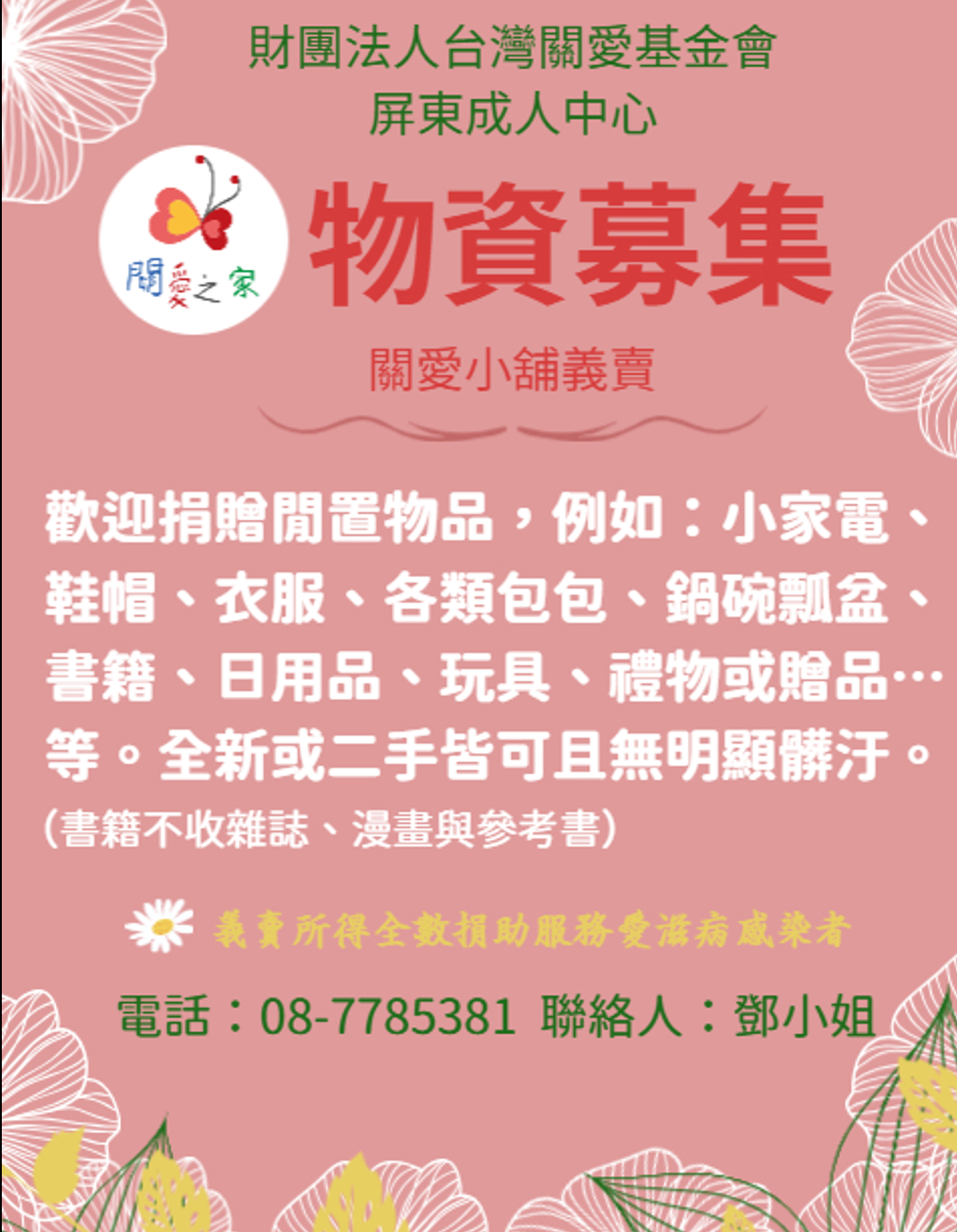 ▲有意捐贈物資或參與公益行動的朋友,歡迎聯繫關愛基金會屏東中心鄧小姐,電話:(08) 778-5381。(圖/屏東分署)