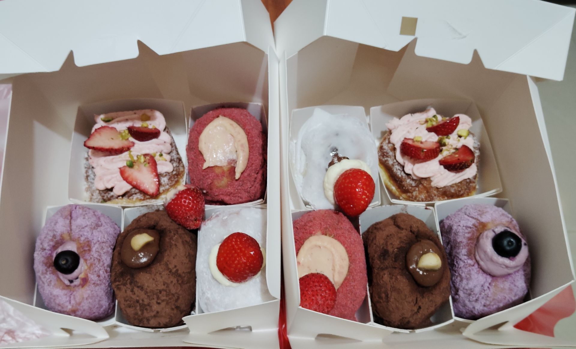 入口瞬間,Q 彈麻糬與鬆軟生甜甜圈交織出雙重柔軟口感,隨後是溫潤香草卡士達緊密包裹的新鮮草莓果肉,酸甜平衡恰到好處,層次由外而內完美融合Q、鬆、滑、脆 四重享受,讓每一次咬下都是驚喜堆疊,絕對是選擇障礙族群