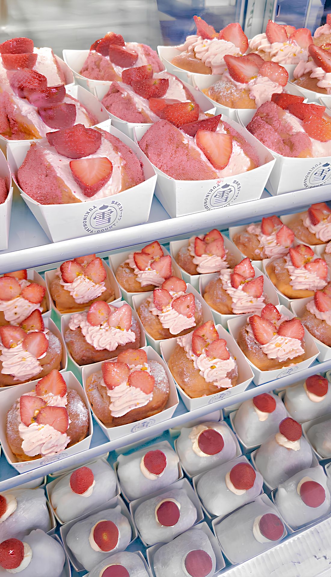 甜甜圈內層再抹上細緻草莓鮮奶油,最上方鋪滿嚴選新鮮草莓切片,粉嫩與鮮紅交織出日式雪中花園般的視覺饗宴。生乳香細緻、口感如雲朵般綿密堆疊,是能溫柔驅散冬日寒意的一抹「光之滋味」。