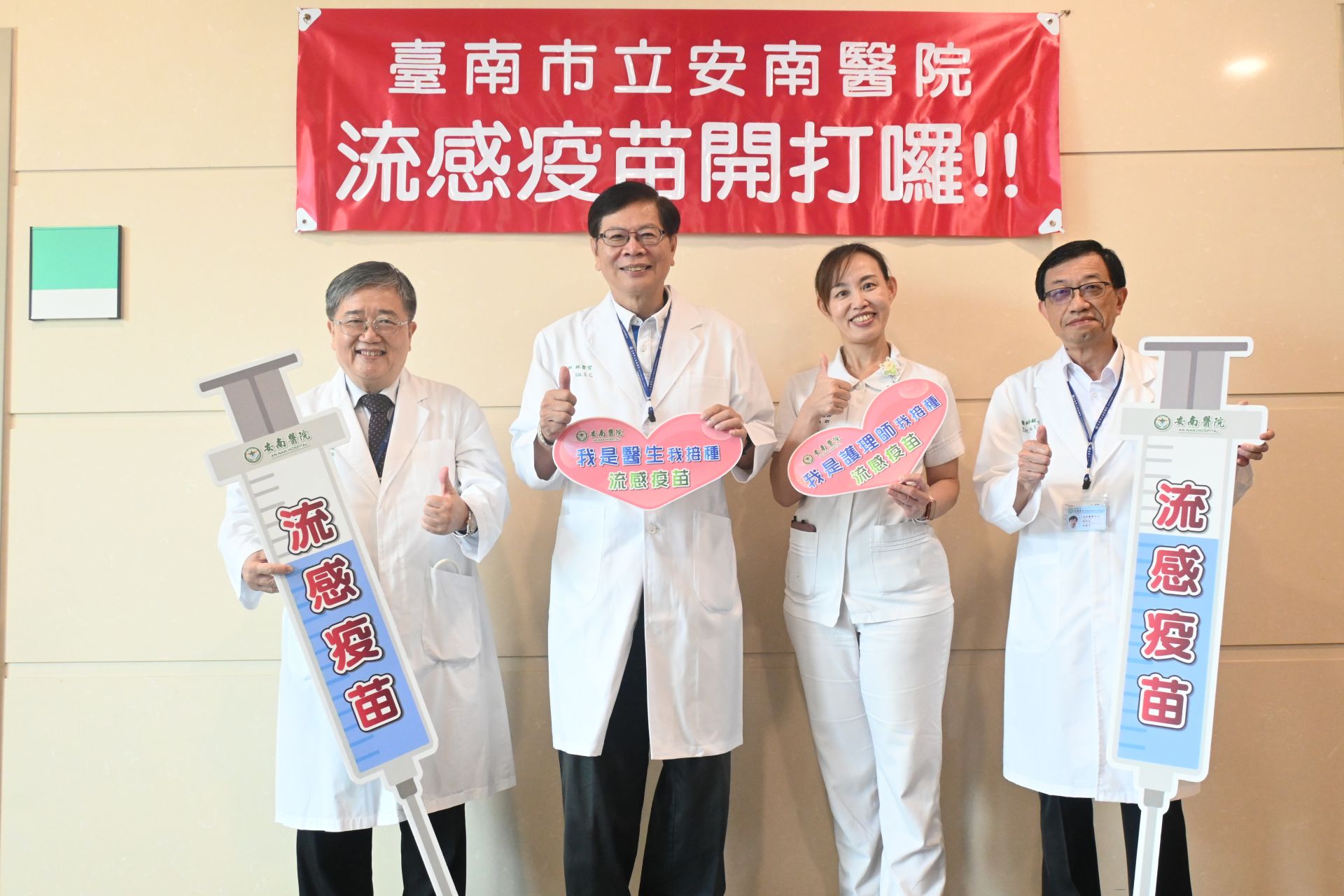 台南市立安南醫院1日流感疫苗開打,院長林聖哲與院內多位主管率先接種,並鼓勵同仁和民眾及早施打,以降低感染流感與新冠等呼吸道疾病的風險。林聖哲院長表示,從去年的「左流右新+肺鏈」到今年的「智防•醫新•健鏈」,安南醫院希望讓防疫不僅止於疫苗,更能擴展到智慧監測與全人照護,幫助市民守護健康。