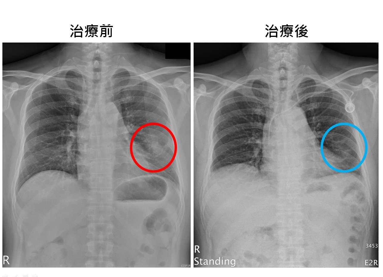 40歲男性個案接受治療後,與治療前相比(左圖紅圈處),腫瘤已明顯變小(右圖藍圈處)
