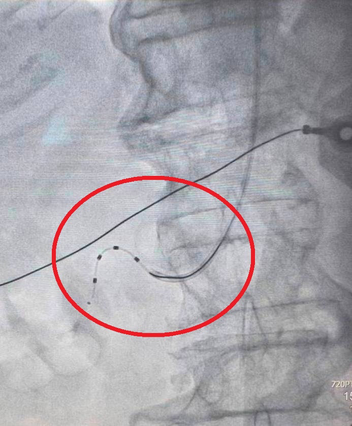 85歲病人血壓不穩定,以導管腎臟交感神經阻斷術降低腎交感神經活性(紅圈處)後,大幅改善狀況。