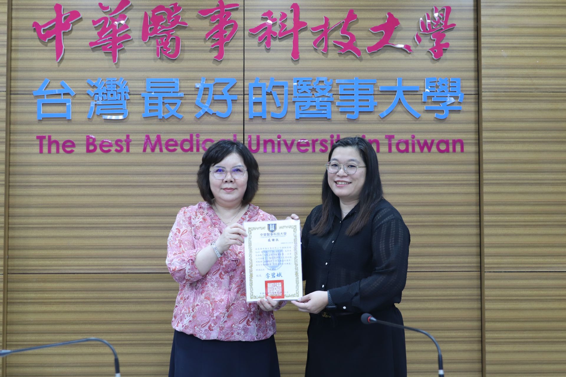 ▲中華醫大李碧娥校長(左)代表學校致贈感謝狀給禾韻生醫公司代表,產學攜手啟動失智症精準檢測計畫。(圖/中華醫大提供)