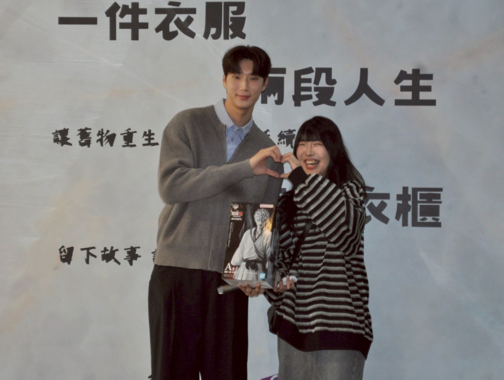 模特兒演員金雲(左)出席醒吾二手拍賣會,捐出珍藏公仔「黑崎一護」義賣,由時管系學生徐安蒂開心拍下。(圖/翻攝)