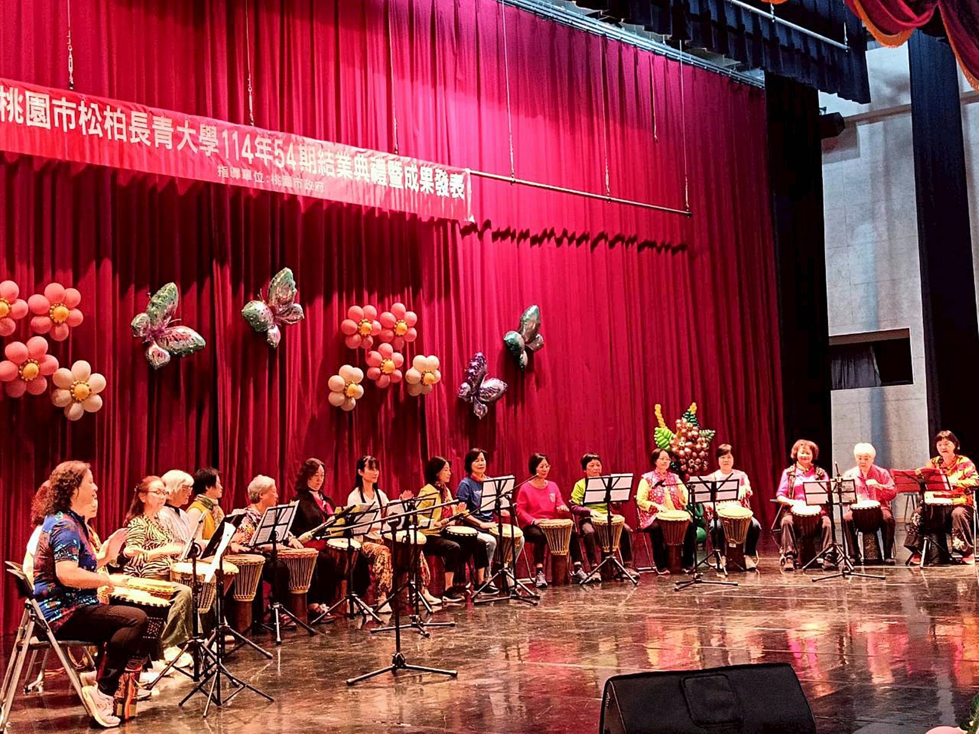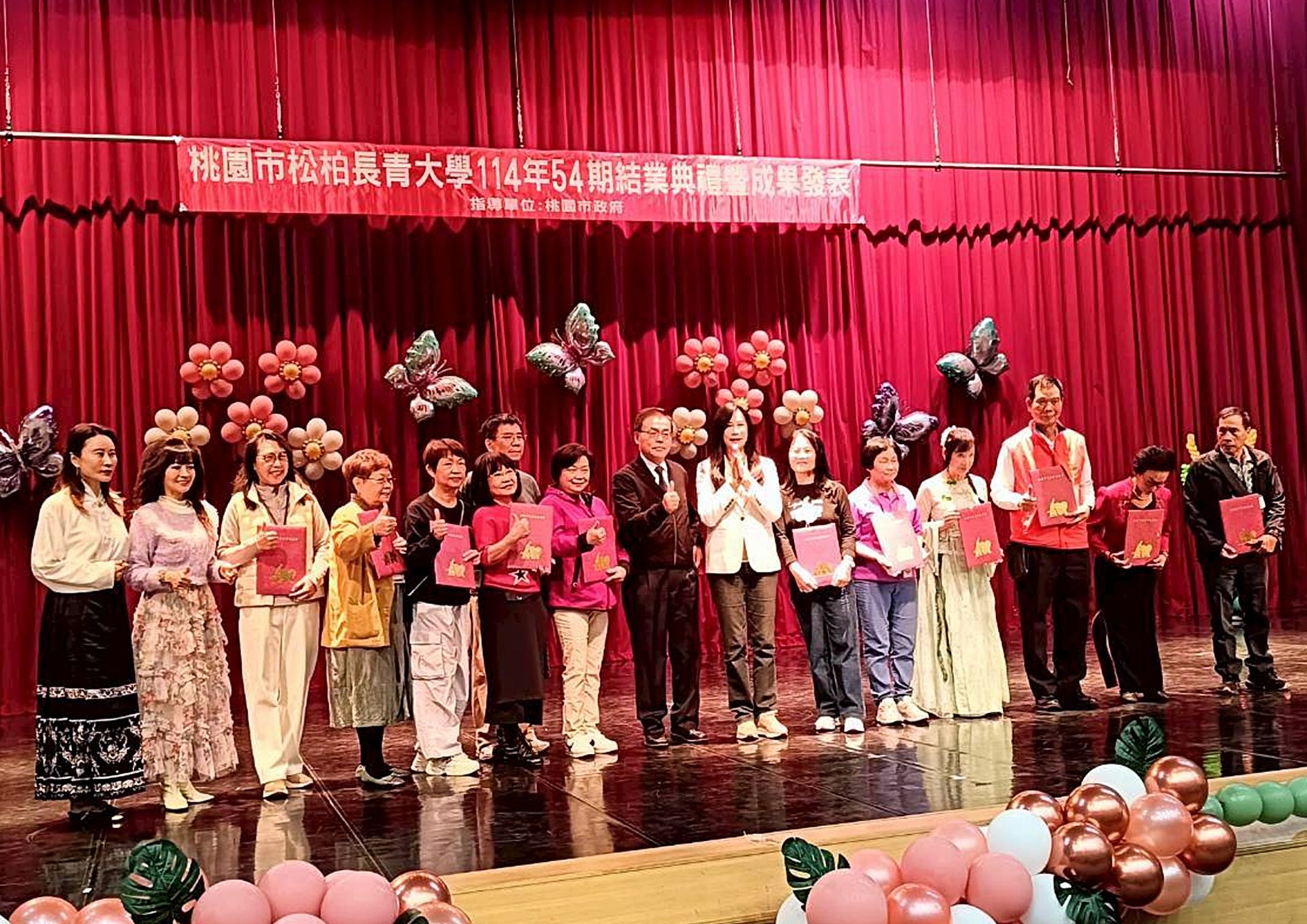 桃園市松柏長青大學第54期成果發表暨結業典禮,今(22)日上午在桃園市立桃園高中演藝廳溫馨舉行,松柏長青大學主任委員呂朝福表示目前學員超過1,500名,但演藝廳座位僅可容納400人,因此本次特別規劃為動態成果發表為主,讓學員以舞蹈、律動與音樂展現最有活力、最精彩的年度成果發表。
