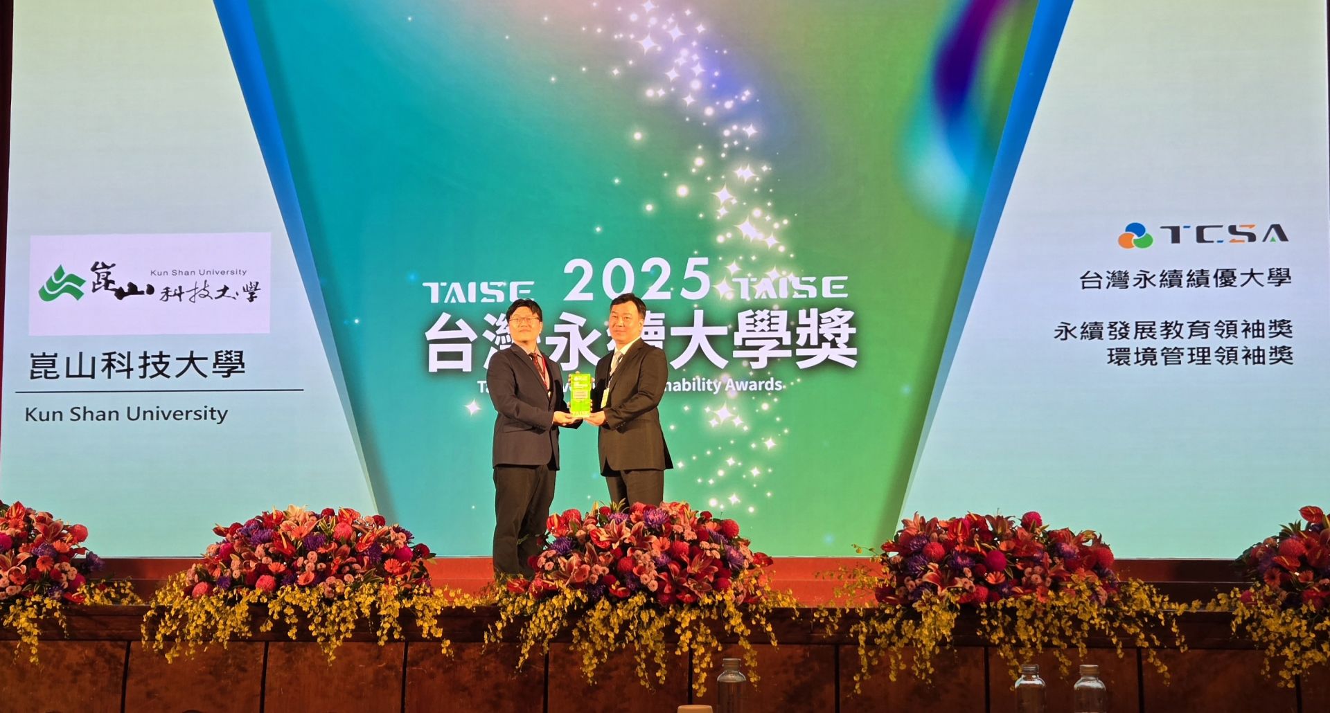 台灣永續能源研究基金會(TAISE)主辦「TCSA台灣企業永續獎」已邁入第18屆,今年舉辦第二屆「台灣永續大學獎」評選活動,並於11月26日於台北圓山大飯店舉行頒獎典禮。崑山科技大學不僅拿下「台灣永續績優大學獎-永續綜合績效獎」,在永續單項績效的部分,更榮獲「環境管理領袖獎」及「永續發展教育領袖獎」,顯見「永續發展」已經校園內扎根茁壯,並拓展至校園外。