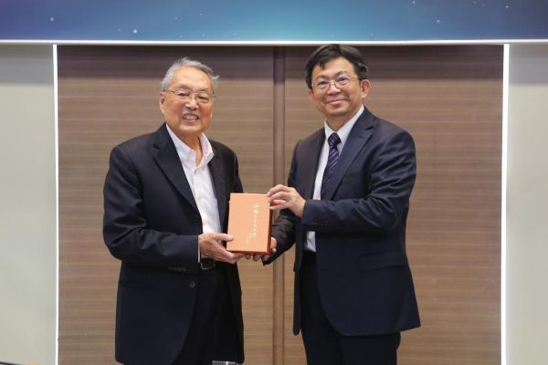 圖2:中山大學校長李志鵬(右)致贈已故詩人、中山大學外文系榮譽退休教授余光中詩畫札記本(絕版品),予國際創新長壽社企董事長施振榮。