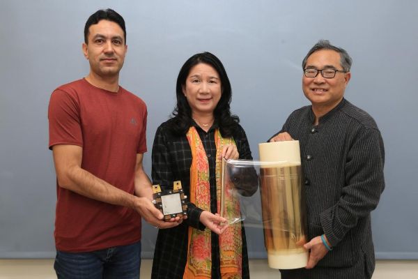 圖2:國立中山大學光電工程學系教授黃文堯(右)、張美濙(中)團隊研發新型質子交換膜,研究成果獲登「國際氫能期刊」(International Journal of Hydrogen Energy)。共同作者光電系博士生Abid Hussain(左)手持應用質子膜的燃料電池單電池。