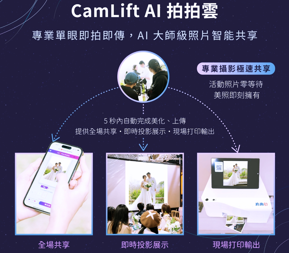 CamLift AI 拍拍雲的特色在於「即時影像」、「AI 自動美化」、「全場共享」與「現場互動」,能快速活絡活動氣氛,增加參與度。