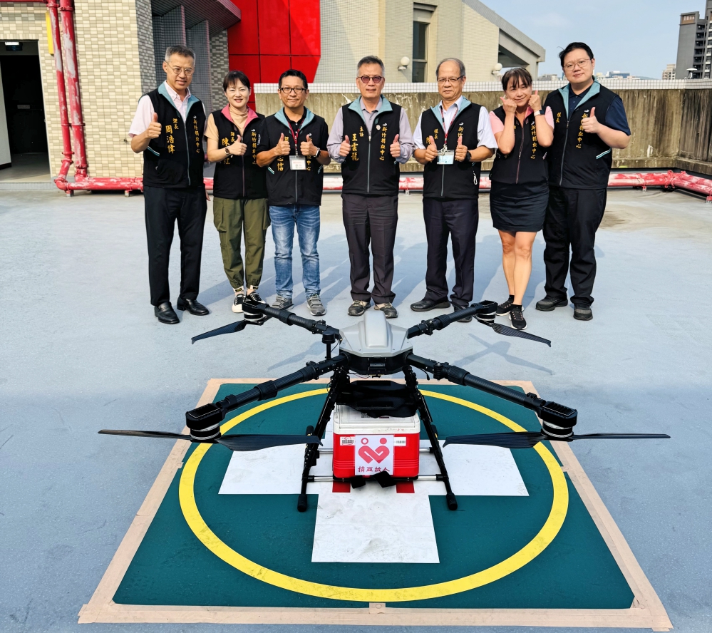 ▲新竹捐血中心舉辦「無人機緊急醫療送血展演」,無人機成功攜帶專業血液運輸容器自新竹捐血中心航行飛往國軍桃園總醫院新竹分院。新竹捐血中心王雲龍主任(中)與同仁於無人機前合影。(圖/新竹捐血中心提供)