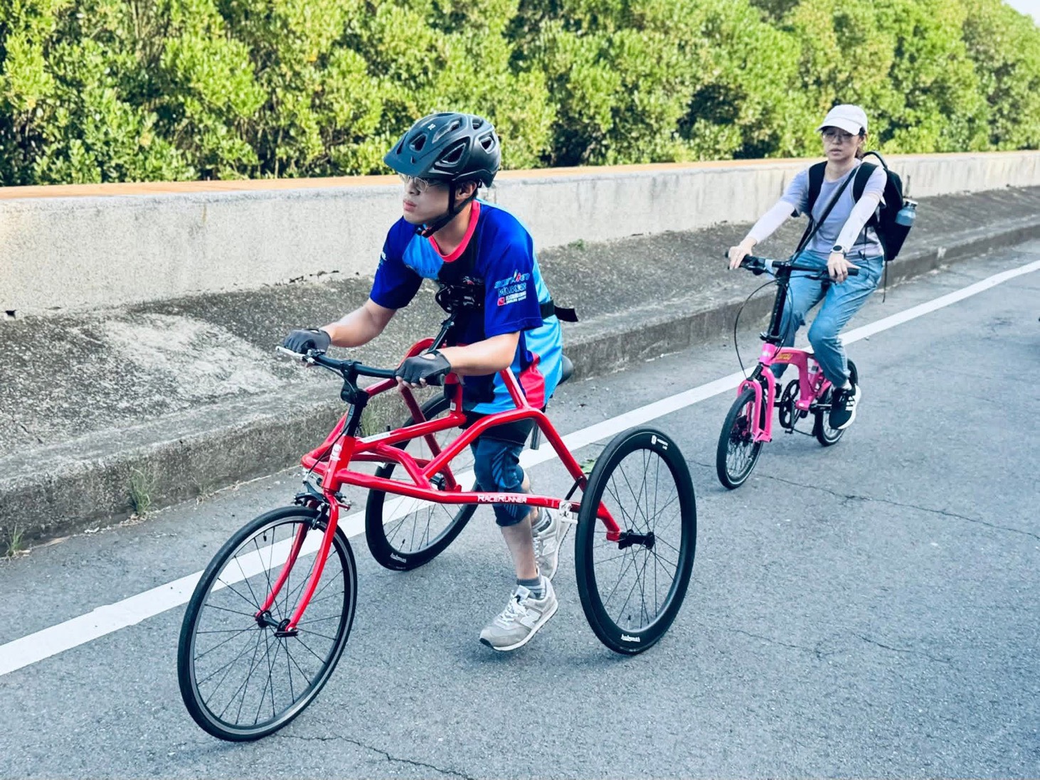 ▲2025年太平洋自行車單車公益家庭日,腦麻框架徑賽運動台灣代表選手 沈迦佑(圖左), 一同參與參活動與並完成12公里賽程。(圖/太平洋自行車提供)
