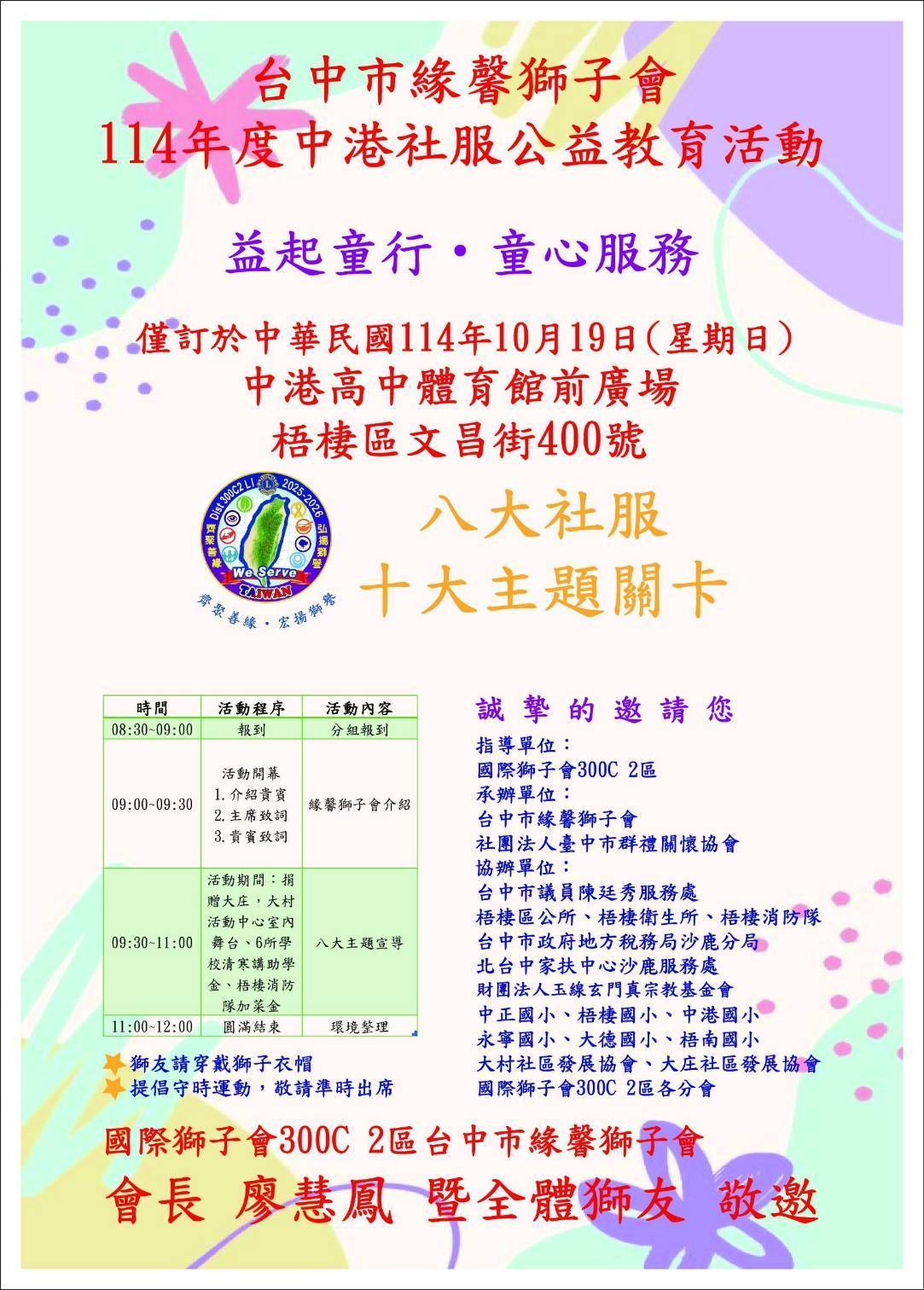 緣馨獅子會誠摯邀請家長帶著孩子一起來,10月19日早上就到港區綜合體育館走一走、玩一玩,體驗「益起童行、童心服務」的快樂,讓愛與學習同行!