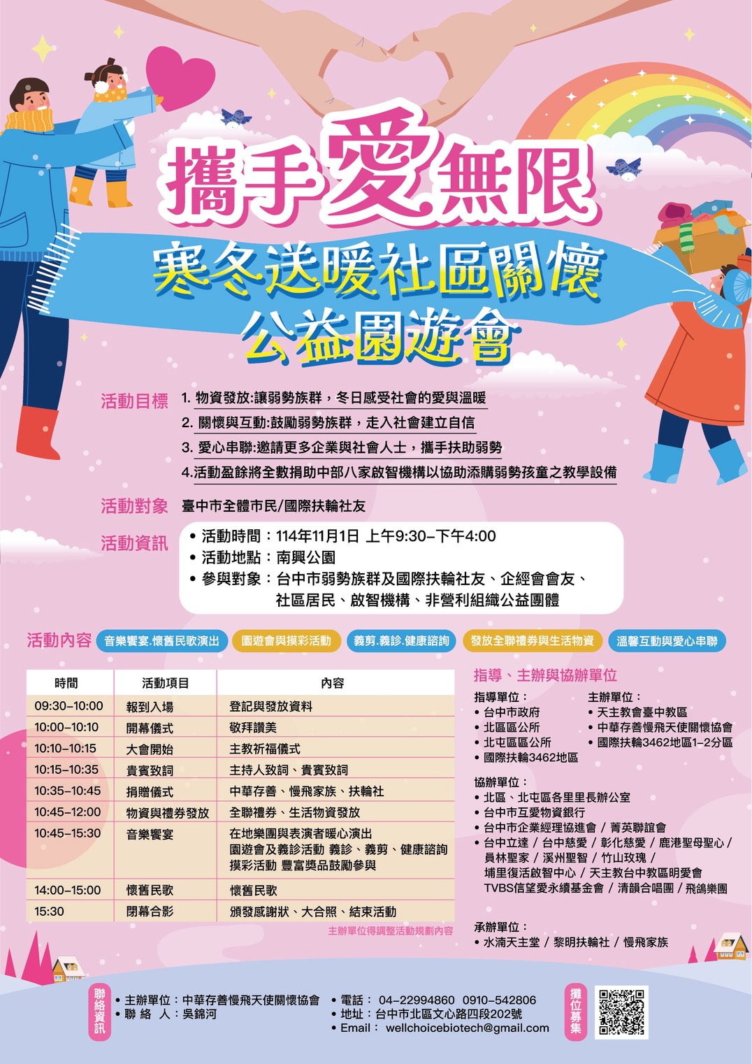 為了讓愛走進社區每個角落、讓關懷成為生活的日常,天主教會台中教區、中華存善慢飛天使關懷協會與國際扶輪3462地區一之二分區共同主辦的「攜手愛無限・社區關懷公益園遊會」,將於 11月1日(六)上午10點至下午4點 在 台中市北屯區南興公園 盛大登場。