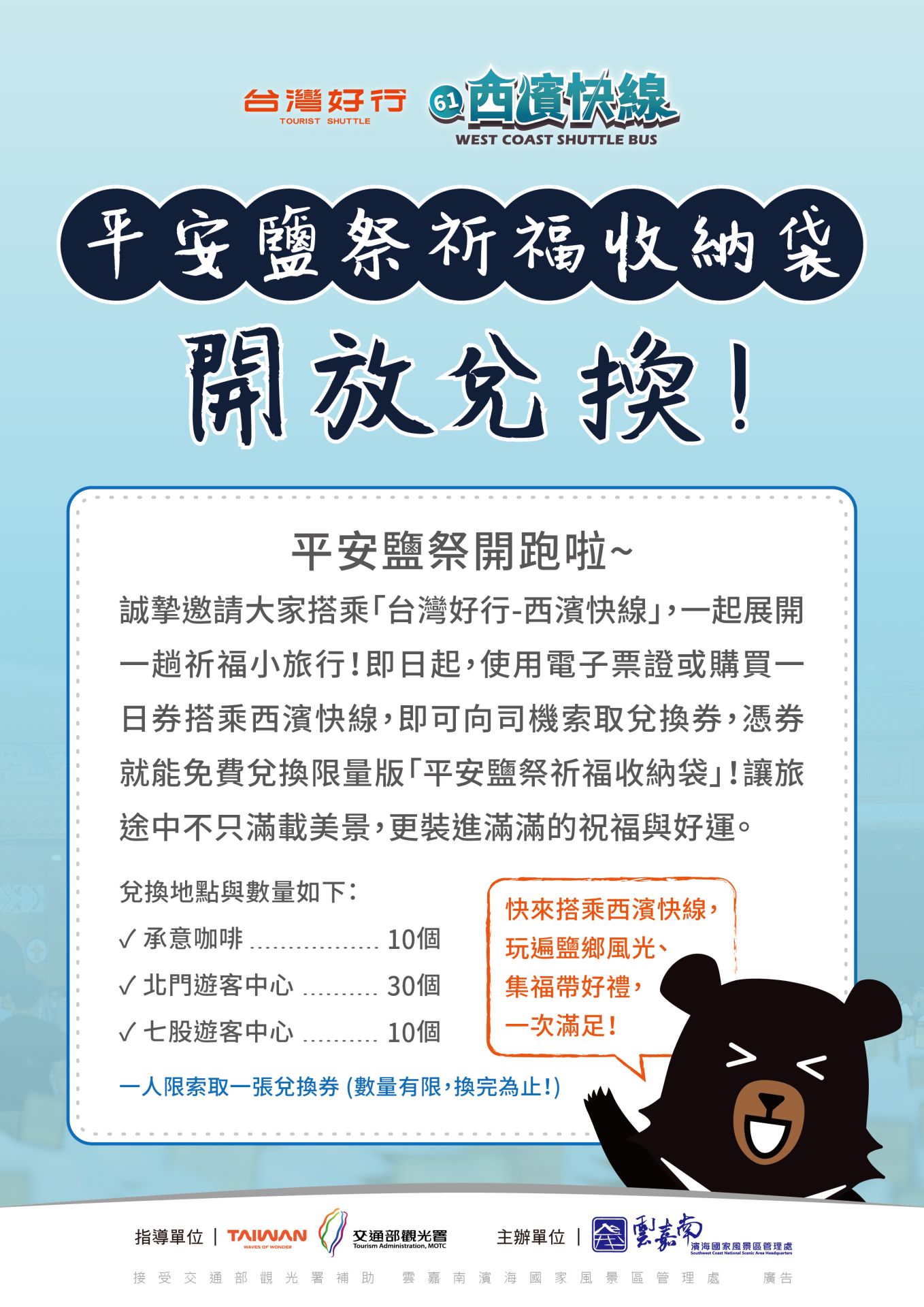 同時,為鼓勵民眾選擇最便捷、最低碳的交通方式,「台灣好行-西濱快線」推出平安鹽祭專屬好康!這是您參與盛會、兼享獨家禮遇的最佳途徑。即日起,旅客只要使用電子票證或購買一日券搭乘西濱快線,憑向司機索取的兌換券,即可於指定地點免費兌換限量版「平安鹽祭祈福收納袋」!