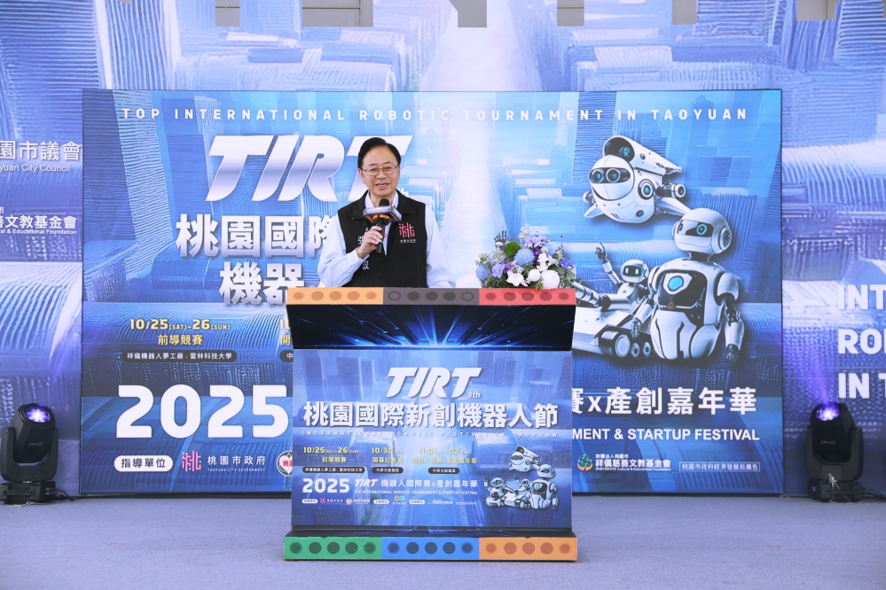 張善政市長指出,今年參賽隊伍破紀錄,來自日本、馬來西亞、澳門等地的選手與專家齊聚桃園,TIRT已是亞洲耳熟能詳的重要賽事。他進一步說明:「未來機器人與人工智慧的結合,將是產業發展的必然方向。八年前AI還未普及,但蔡董事長早已看見趨勢,展現非凡遠見。」桃園市府也同步啟動「青年創業村」計畫,張市長透露:「楊梅的青創基地剛剛動土,土地面積超過三萬坪,首批進駐產業就是無人機。未來將打造全國少有的大型創新基地,結合桃園的工業實力與智慧城市優勢,讓機器人產業在國際發光發熱。」