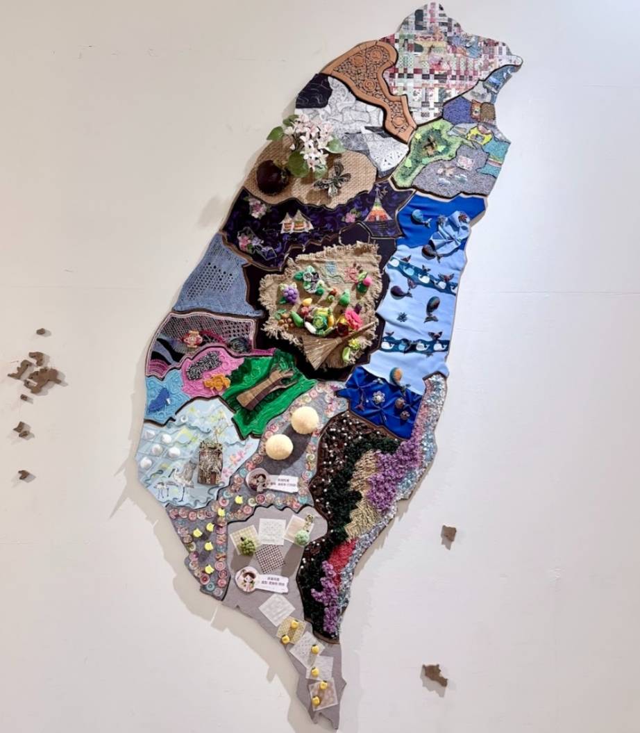 展覽中特別值得一提的是,13位藝術家共同以複合媒材創作的《台灣地圖》作品,將山海、鄉城、風土與人情融為一體,象徵這片土地的生命力與文化厚度。觀眾不僅能欣賞到藝術的細膩與多樣,也能透過作品感受到藝術家對家鄉的深厚情感。
