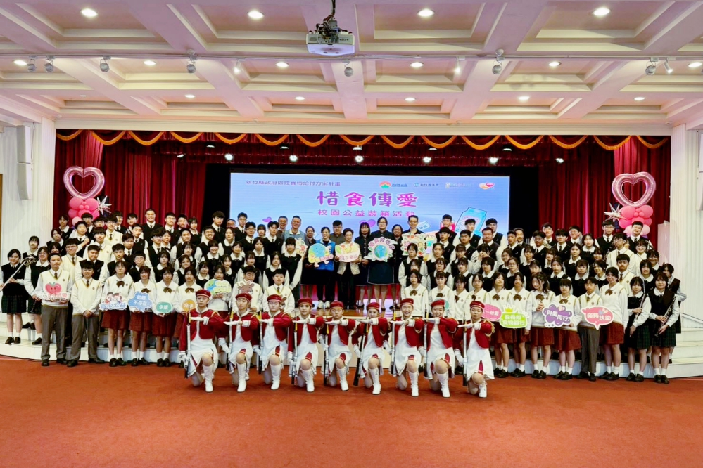 ▲新竹縣府與安得烈慈善協會和忠信學校一同舉辦「惜食傳愛」校園公益裝箱活動合影。(圖/竹縣府提供)